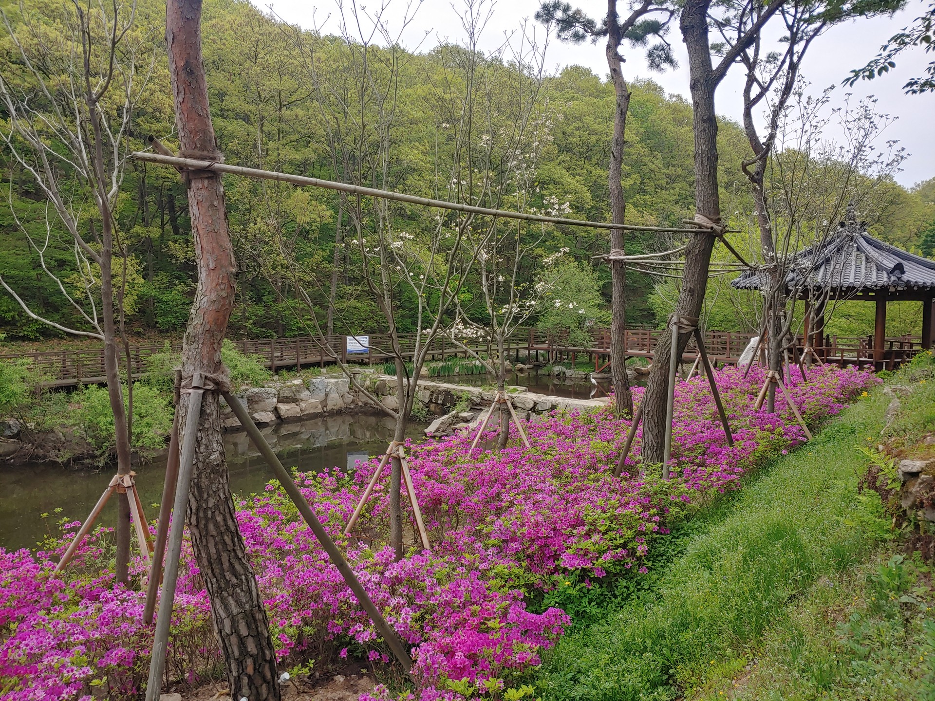 사방댐의 형성으로 이루어진 습지와 분홍색 철쭉 그리고 푸른 녹음과 정자가 한 폭의 그림 같은 곳입니다. 정자와 나무데크에서 휴식과 산책을 즐겨 보세요.