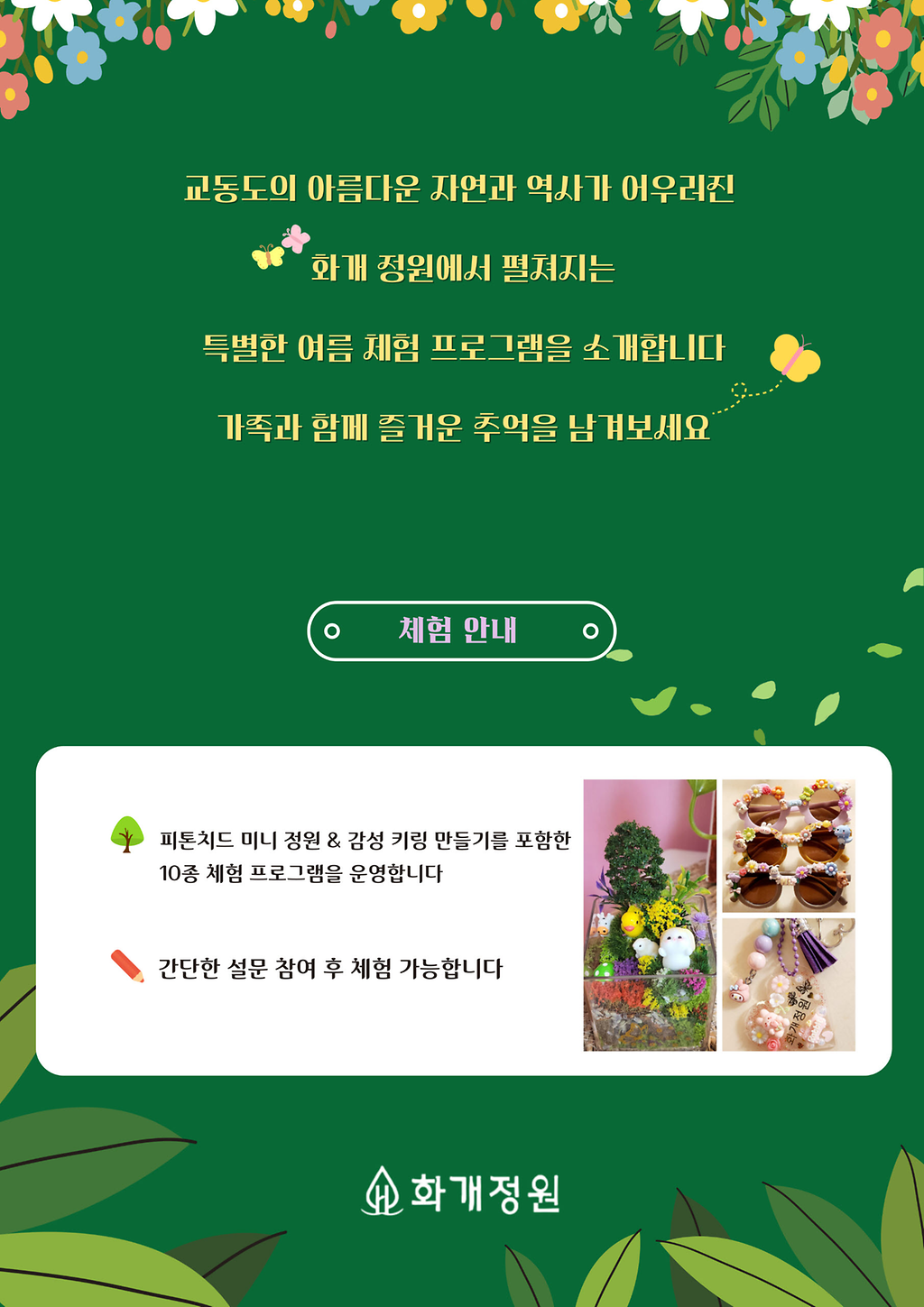 * 행사내용 : 리스 만들기, 감성 키링 만들기, 미니정원 만들기, 추억의 달고나 모양따기, 타투 스티커 등