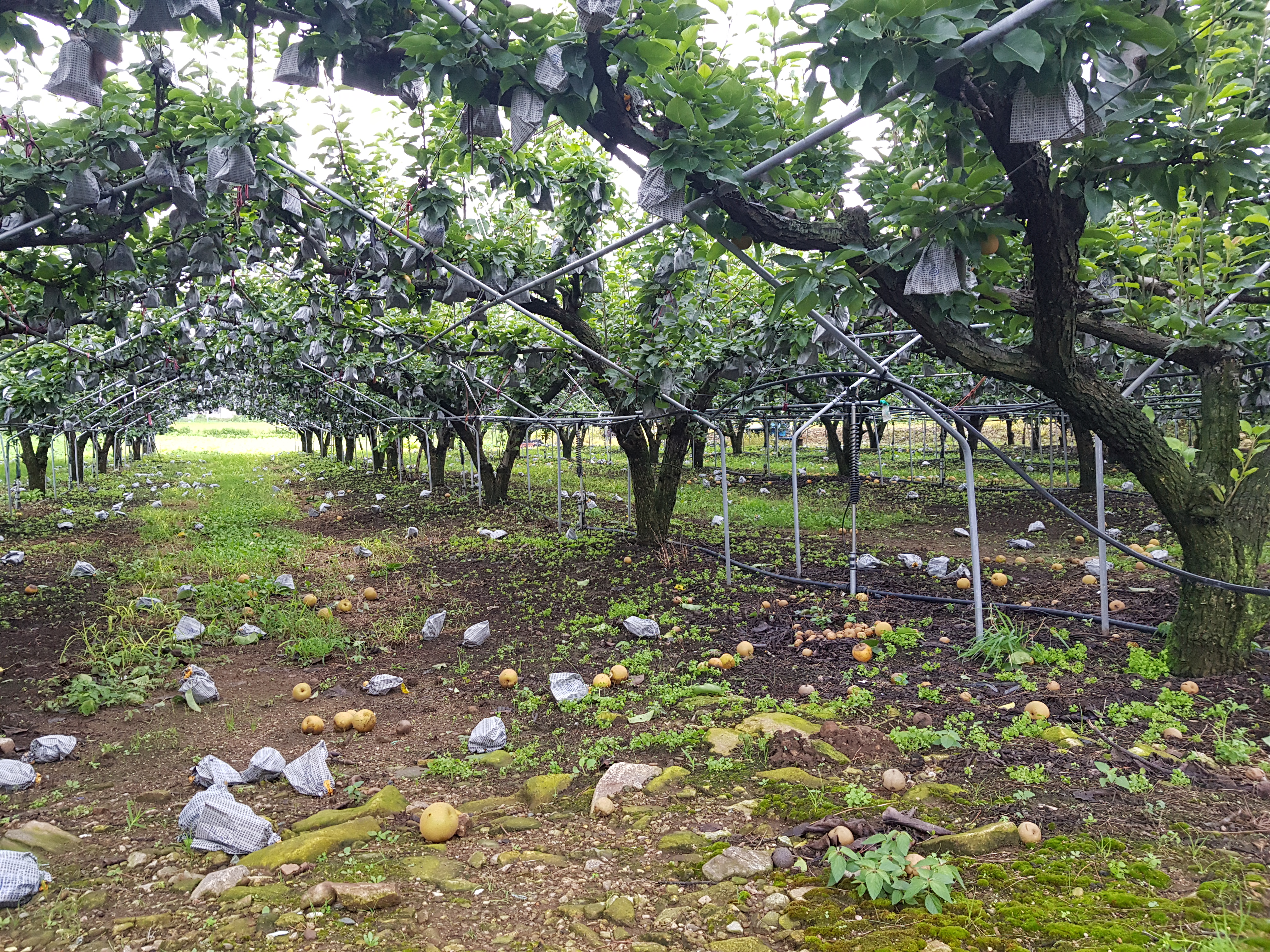 장마철에는 저지대나 배수가 불량한 과수원에서 과실 낙과 및 도복, 가지 열상이 많이 발생하고, 겹무늬썩음병이나 노균병 등의 병해충 피해도 나타난다. 또한, 장기간 침수될 경우에는 조기 낙엽, 부정근 형성, 뿌리 괴사 등이 일어난다.