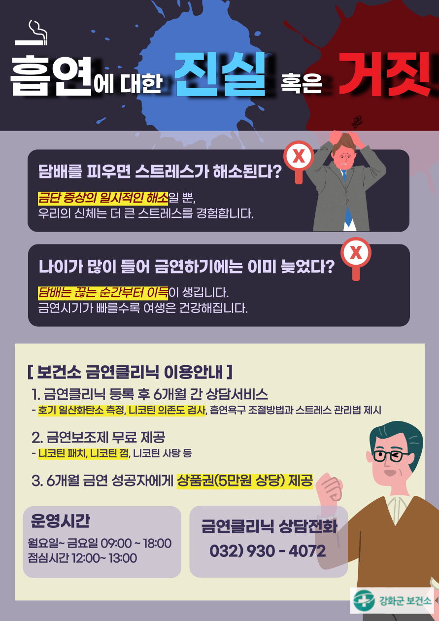 | 흡연에 대한 진실 혹은 거짓!! 괜찮은 담배는 없습니다. 강화군보건소 금연클리닉에서 금연을 도와드립니다. 상담전화 032) 930-4072 * 자료의 무단복제 및 배포를 금하며, 인용시 출처를 명시해 주시기 바랍니다. |