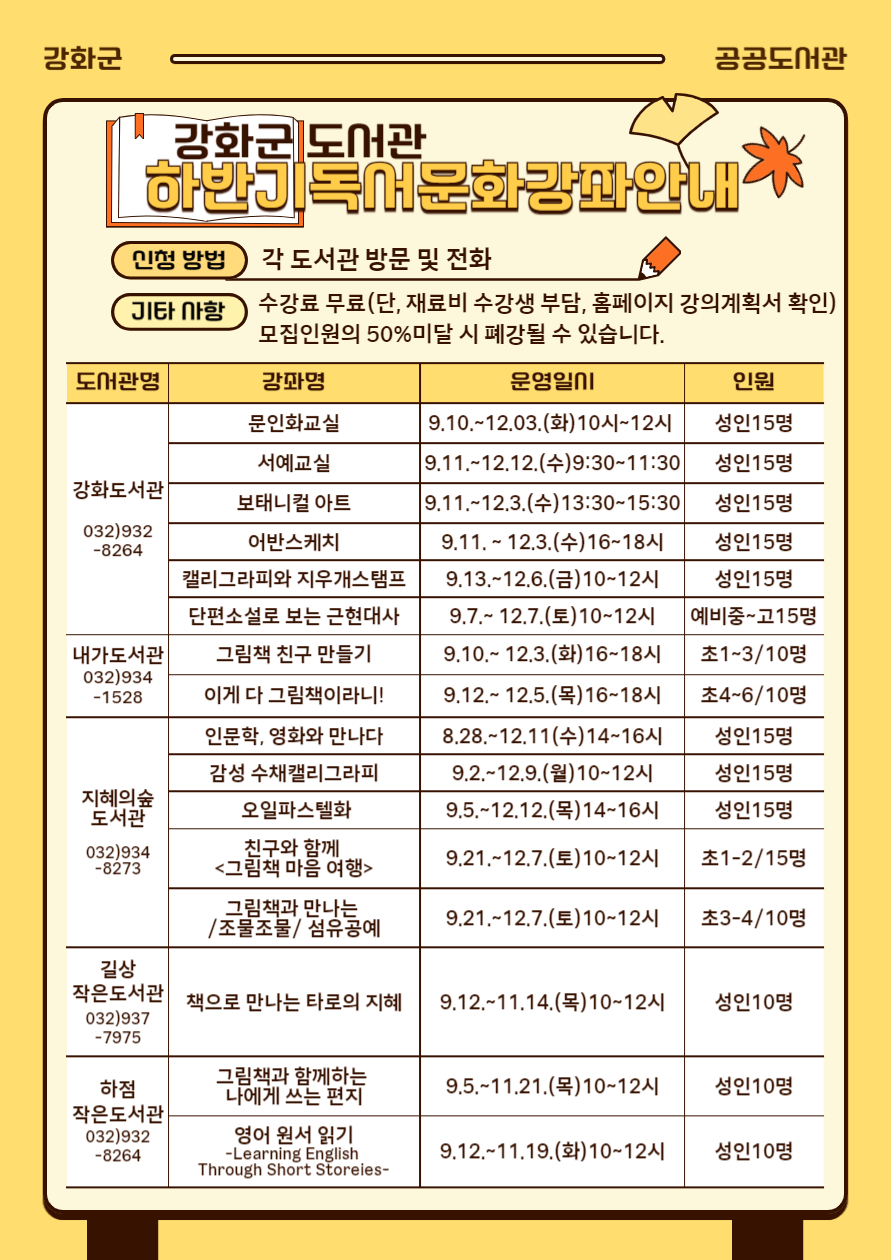 강화군 도서관 하반기 강좌 수강생 모집안내