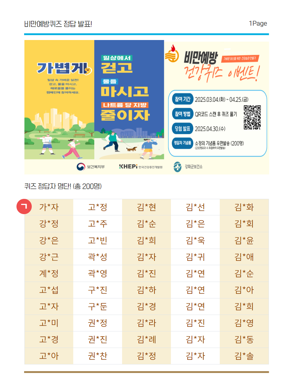2025. 03. 04.~ 2025. 04. 25.까지 운영한 비만예방 퀴즈 이벤트 정답 및 당첨자(정답자) 200명 발표합니다!