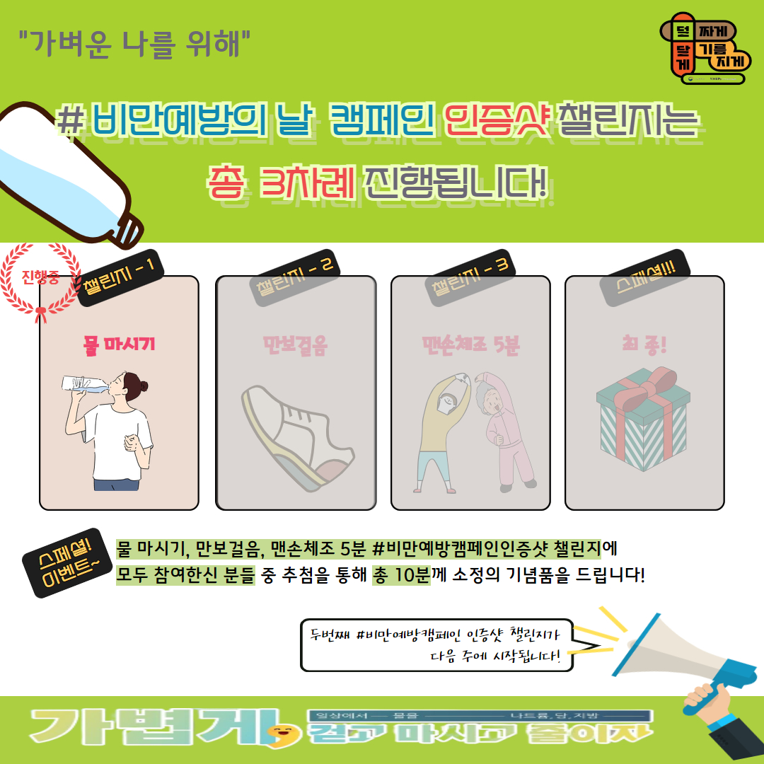 ※ 스페셜이벤트 : 비만예방캠페인 인증샷 챌린지(물마시기, 만보걸음, 맨손체조 5분)에 모두 참여한 자 중 추첨을 통해 10명에게 소정의 기념품 증정