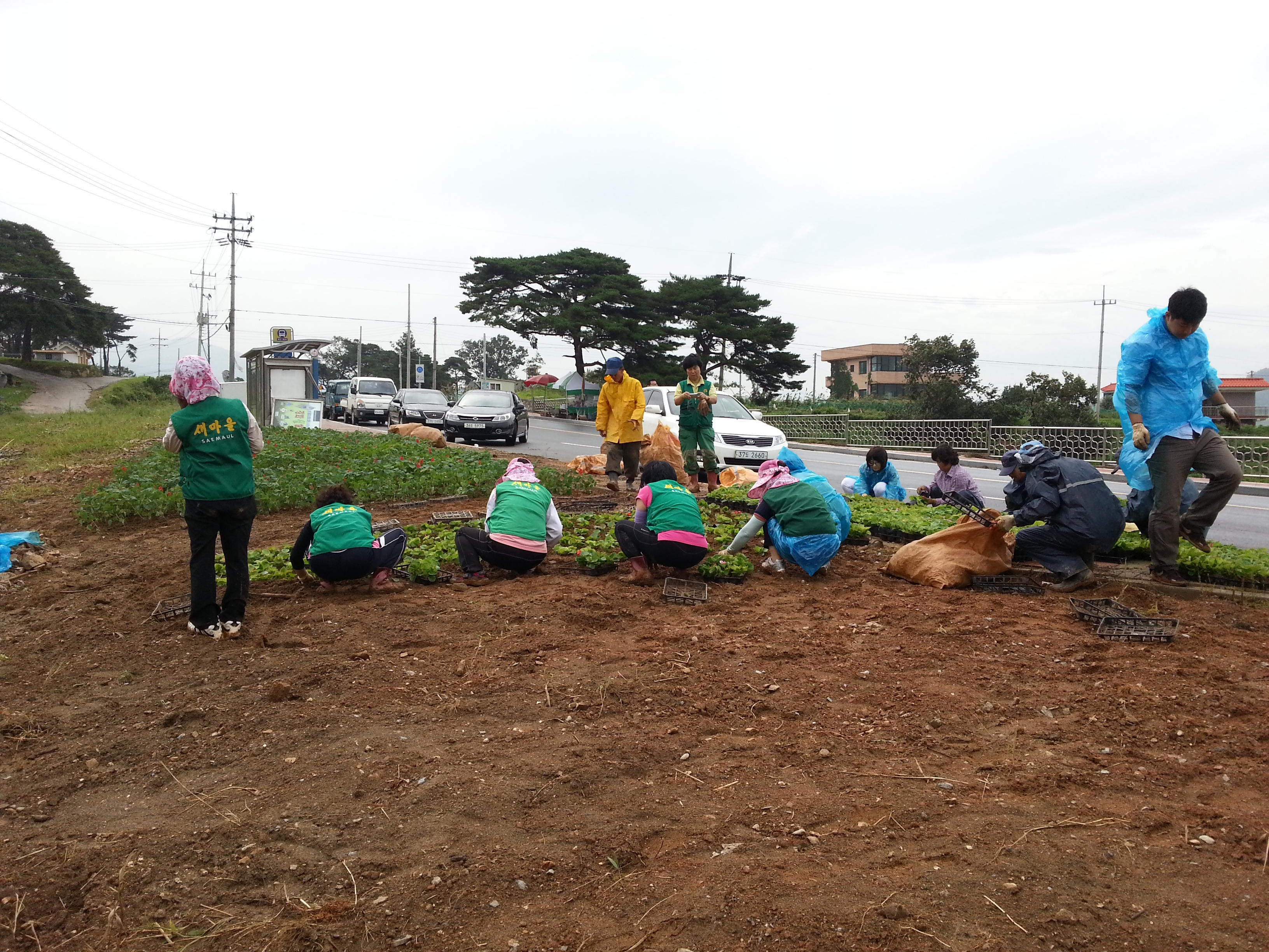 비가 오는 중에도 불구하고 인산리 도로변과 인산저수지 인근에 국화 2,000주, 사루비아 2,000주,