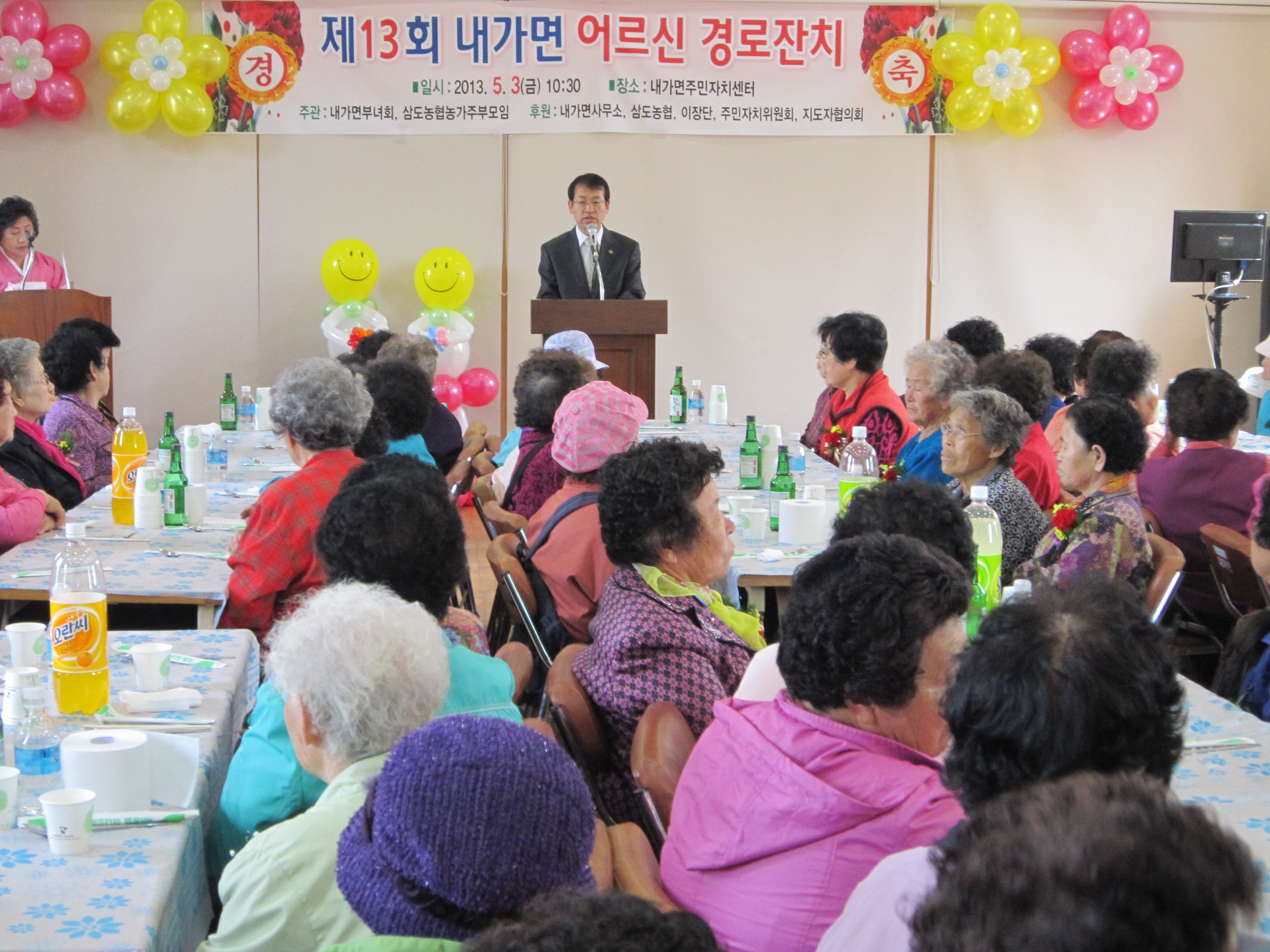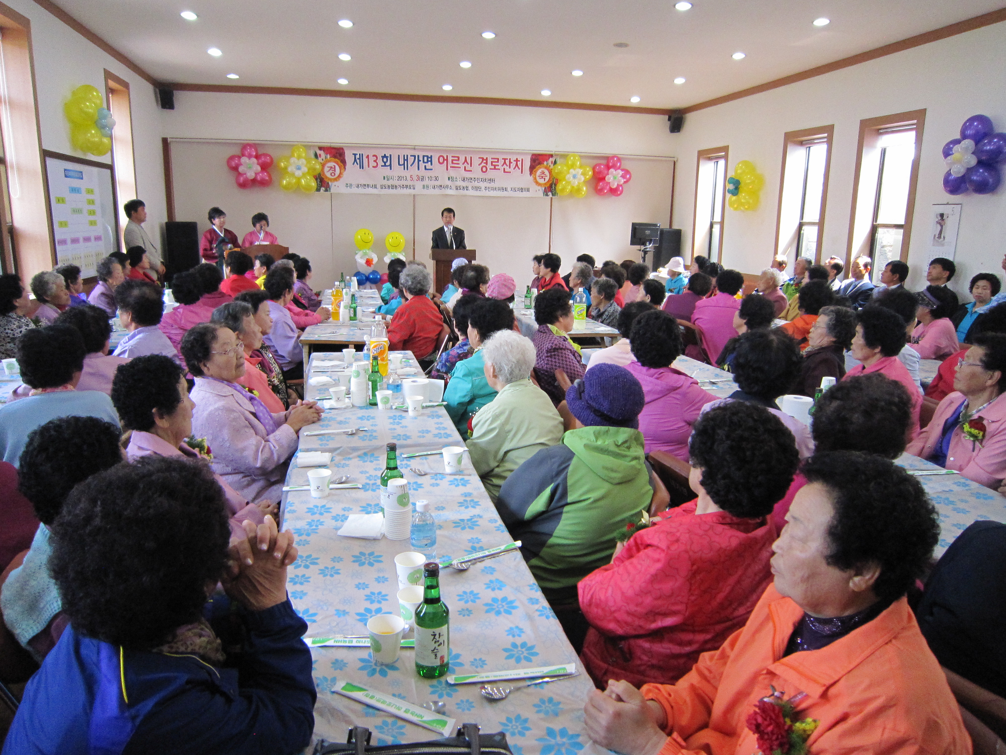 □ 내가면 새마을부녀회(회장 구숙감)과 삼도농협 농가주부모임(회장 이순애)는 2013. 5. 3(금) 내가면주민자치센터에서 내가면사무소, 삼도농협, 이장단, 주민자치위원회, 지도자협의회 후원으로 제13회 내가면 어르신 경로잔치를 개최하였다.