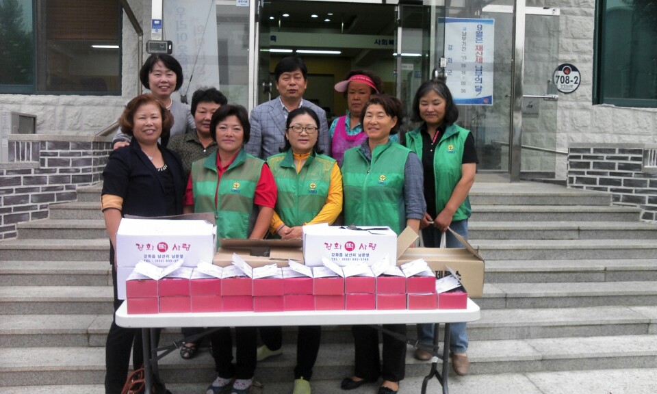 9월 23일(수) 양도면 새마을부녀회 (회장 김호순)는 강화군 새마을 부녀회에서 기탁한 떡 22박스와 양도면 새마을 부녀회에서 준비한 떡 22박스를 합하여 총 44박스를 양도면내의 독거노인 어르신들(44명)을 대상으로 일일이 가정 방문하여 전달하였다.