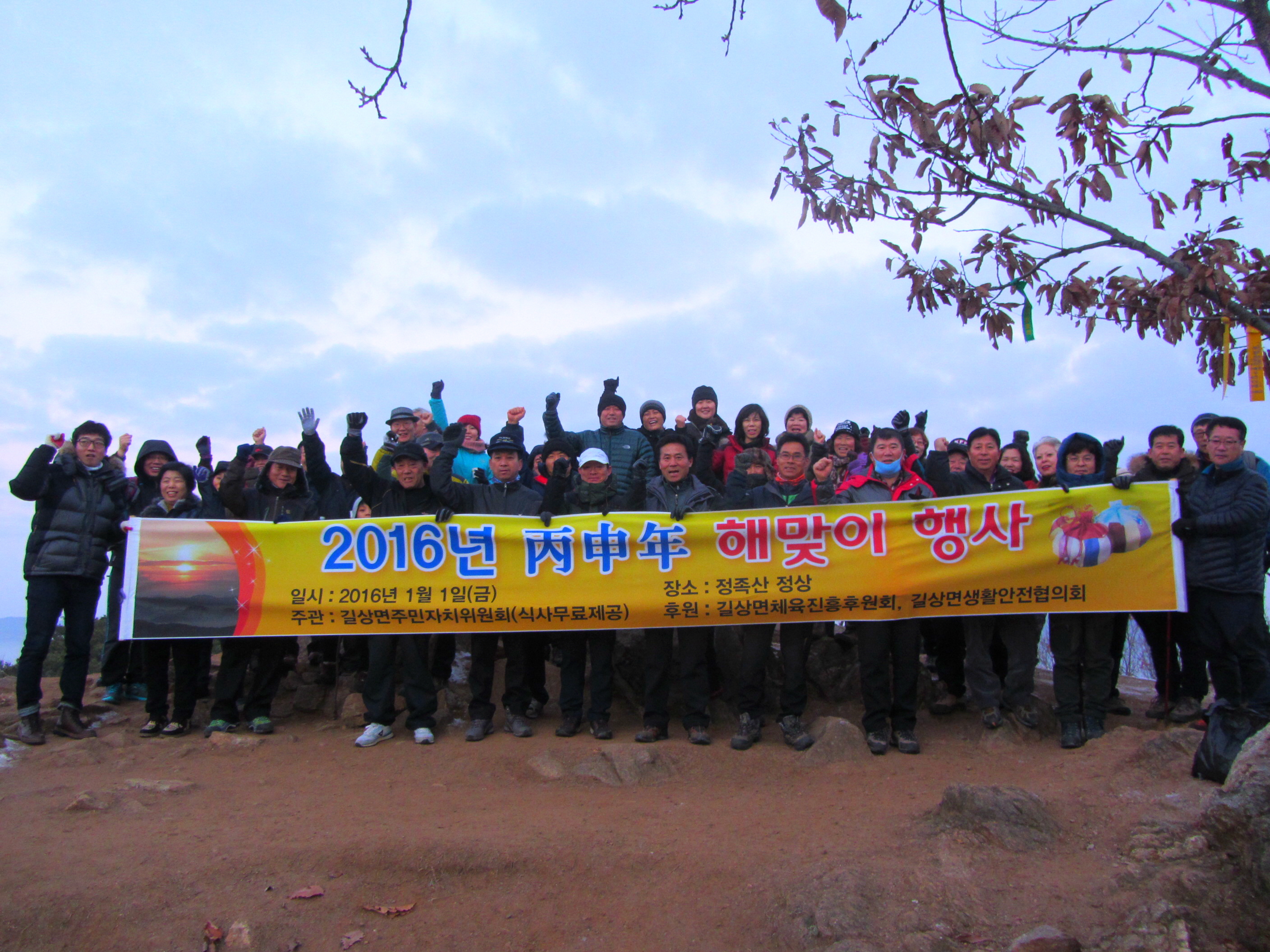 길상면(면장 이선우)에서는 2016. 1. 1(목) 병신년 새해를 맞이하여 정족산 정상에서 새해 소망을 기원하는 해맞이 행사를 가졌다. 이번 행사에는 길상면 주민자치위원회와 이장단 및 남녀새마을지도자 등을 비롯한 관내 주민과 해맞이객 등 150여명이 참여하여 병신년의 첫번째 태양을 바라보며 희망찬 새해를 다짐하고 덕담을 나누었다.
