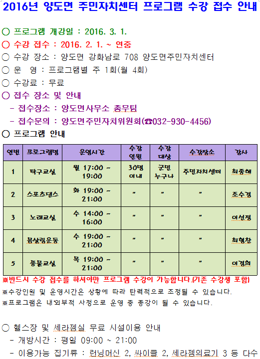 2016년 양도면 주민자치센터 프로그램 수강 접수 안내