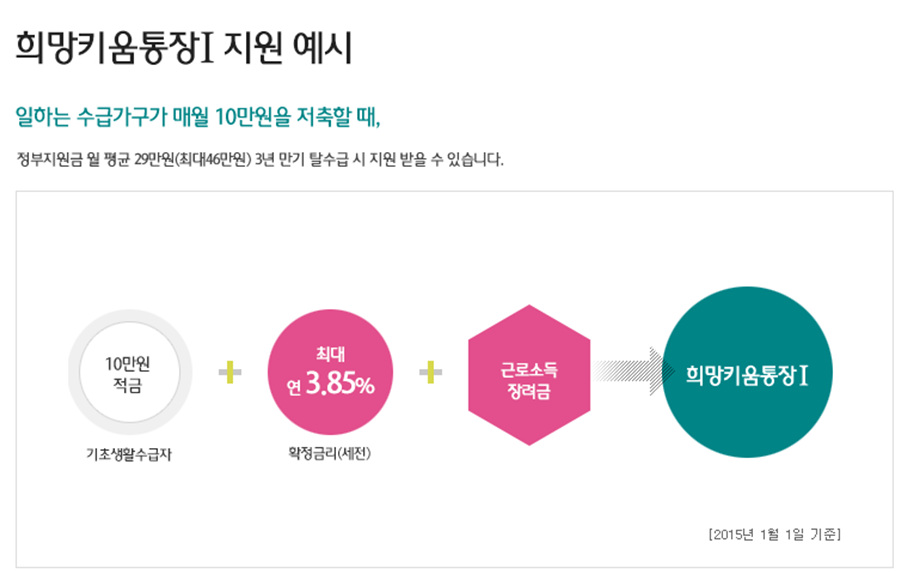 희망키움통장 Ⅰ은 일하는 생계·의료급여 수급가구 중 총 근로·사업소득이 기준 중위소득 40%의 60% 이상인 가구를 대상으로, 본인이 매달 10만원을 저축하면 소득에 비례하여 근로소득장려금을 지원해주는 제도다. 3년 이내 탈수급 시 적립된 근로소득장려금 수령이 가능하다.