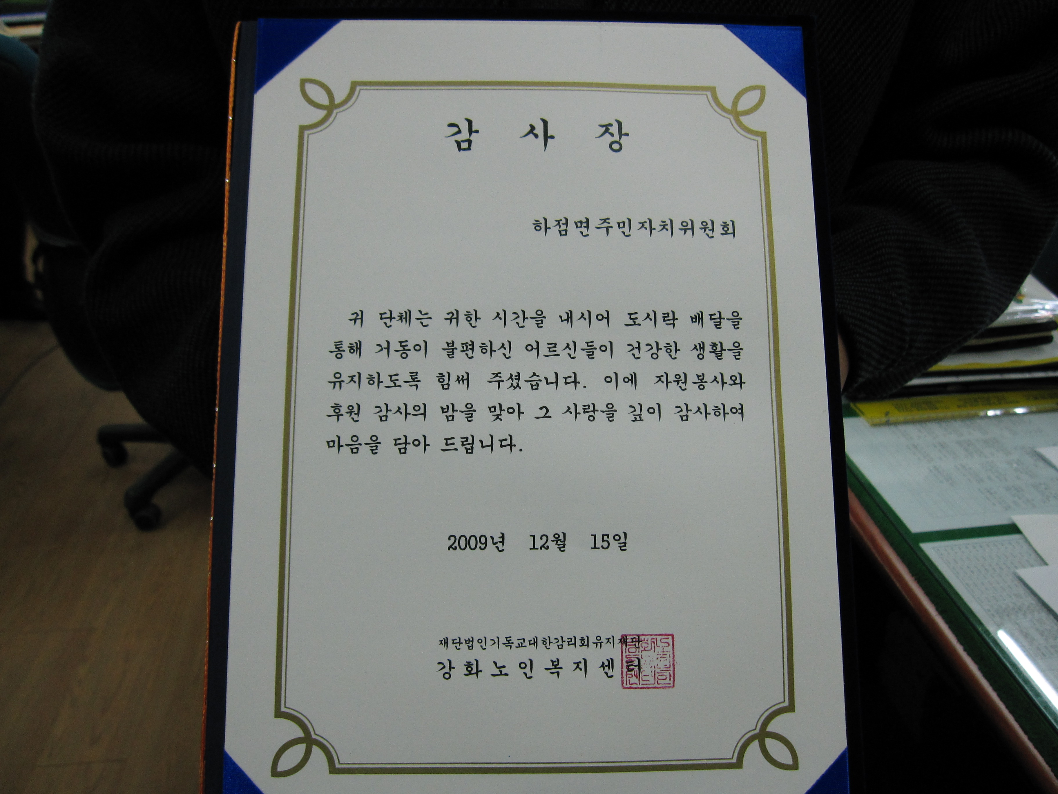 0 내 용 : 한 해 동안 독거노인에게 사랑의 도시락 배달을 열심히 하여주신 덕에
