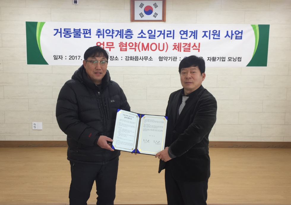 강화읍, 거동불편 취약계층 소일거리 연계 지원 - 강화읍(읍장 임완근)은 자활기업 모닝컴(대표 길현석)과 10일 업무협약을 체결하고 거동이 불편한 취약계층의