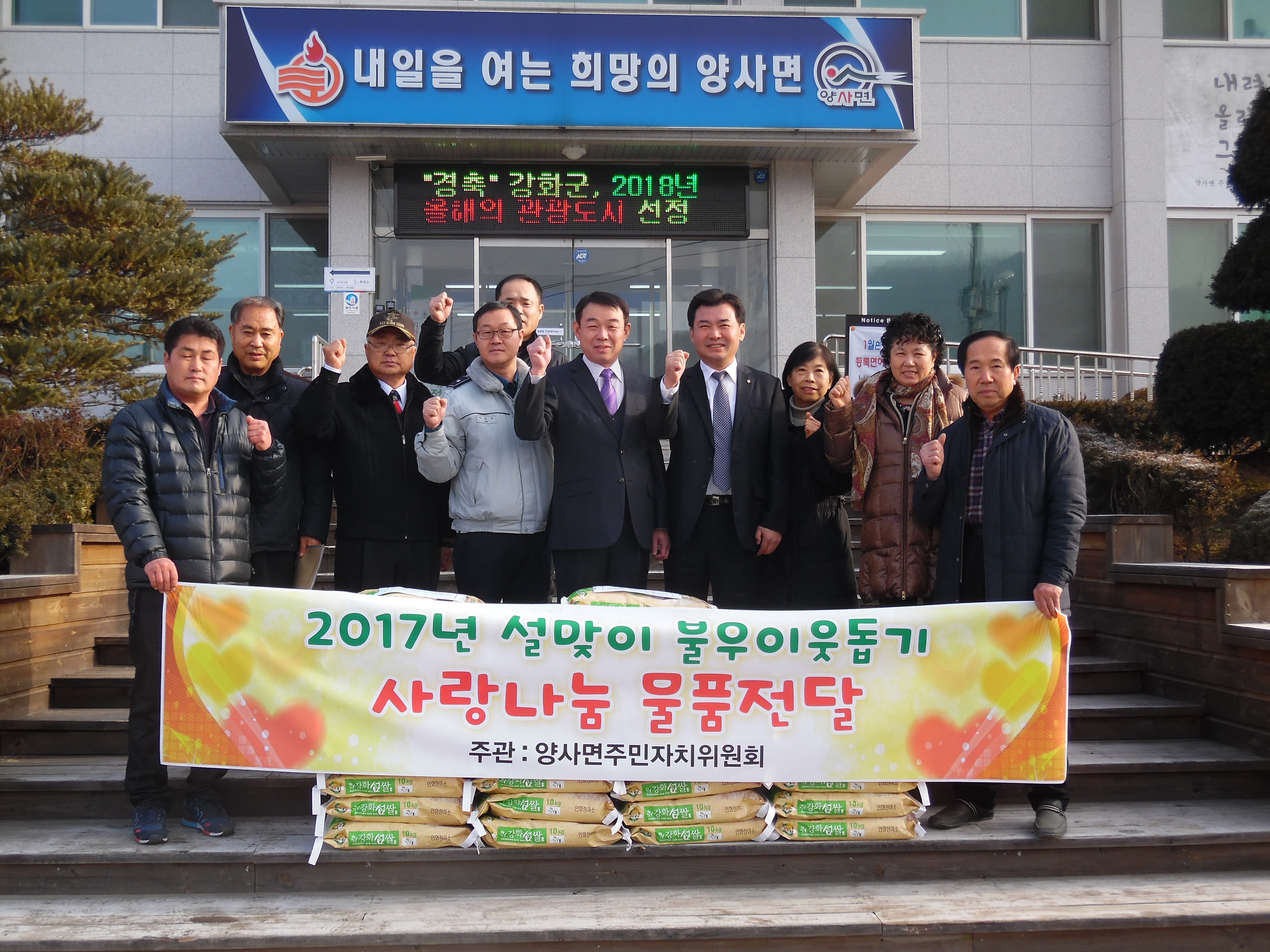 양사면 주민자치위원회가 지난 1월 19일 설을 맞이하여 형편이 어려운 이웃들에게 따뜻한 희망을 전하기 위해 ‘설맞이 사랑나눔 쌀 전달’행사를 가졌다.