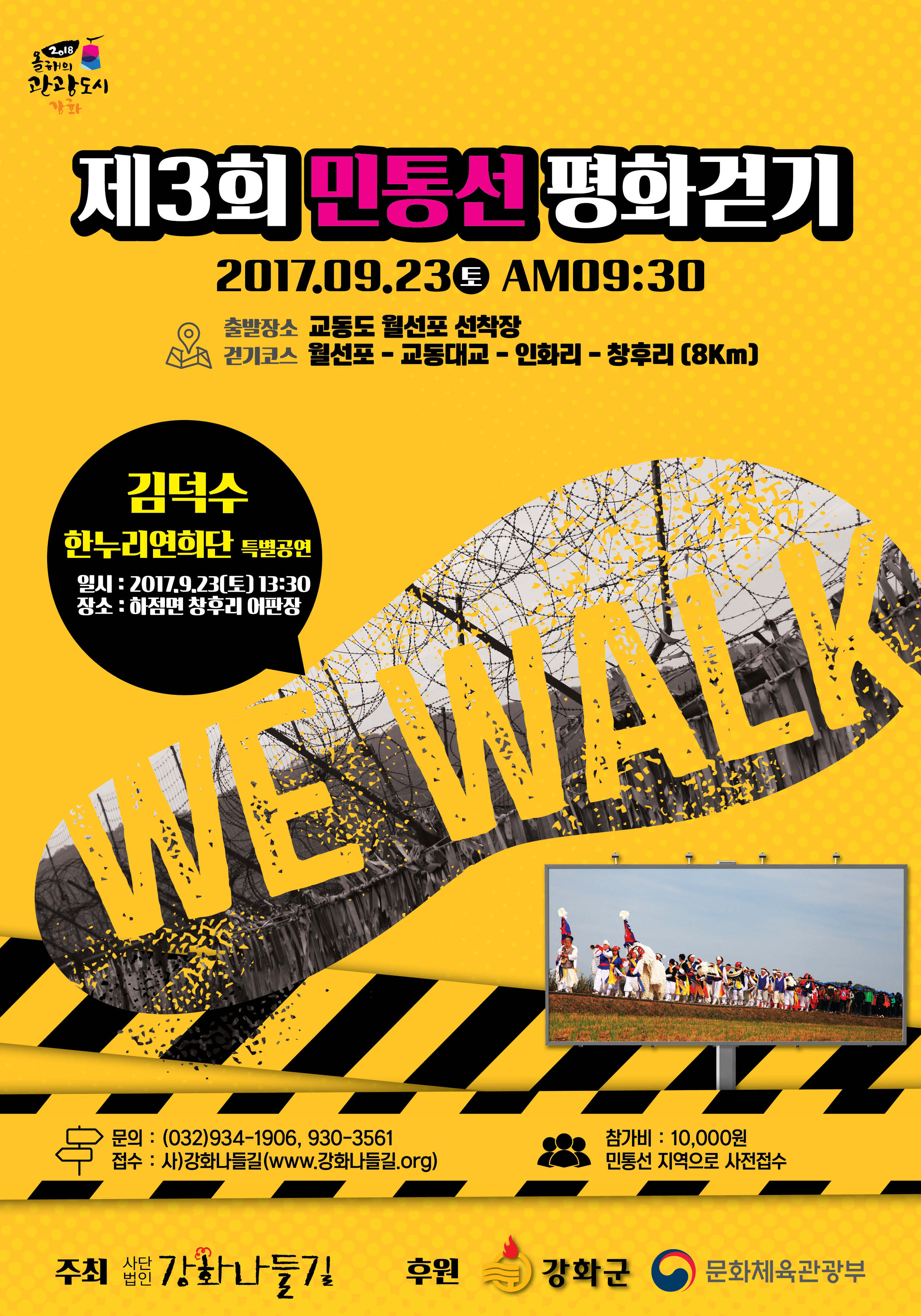 | ◯ 행 사 명 : 제3회 강화 민통선 평화 걷기-더 좋은 나라 통일의 길목에서 ◯ 일 시 : 2017. 9. 23.(토) 09:30 ◯ 출발장소 : 교동도 월선포 선착장 월선포 - 교동대교 - 인화리 - 창후리 (8Km) ◯ 참 가 비 : 10,000원(중식 등) 민통선 지역으로 사전 접수 ※ 김덕수와 한누리연희단 특별공연 2017. 9. 23(토) 13:30 종점 창후리 어판장 ==>1,000여명 참여인원 예상으로 이번 제3회 민통선 평화걷기 행사는 2016년도 문체부 선정 가을여행주간 전국4대 걷기축제에 선정된 행사입니다. 참여하기 원하시는 분은 빠른 신청 바랍니다~ 신청 및 문의 : 사)강화나들길 934-1906 |