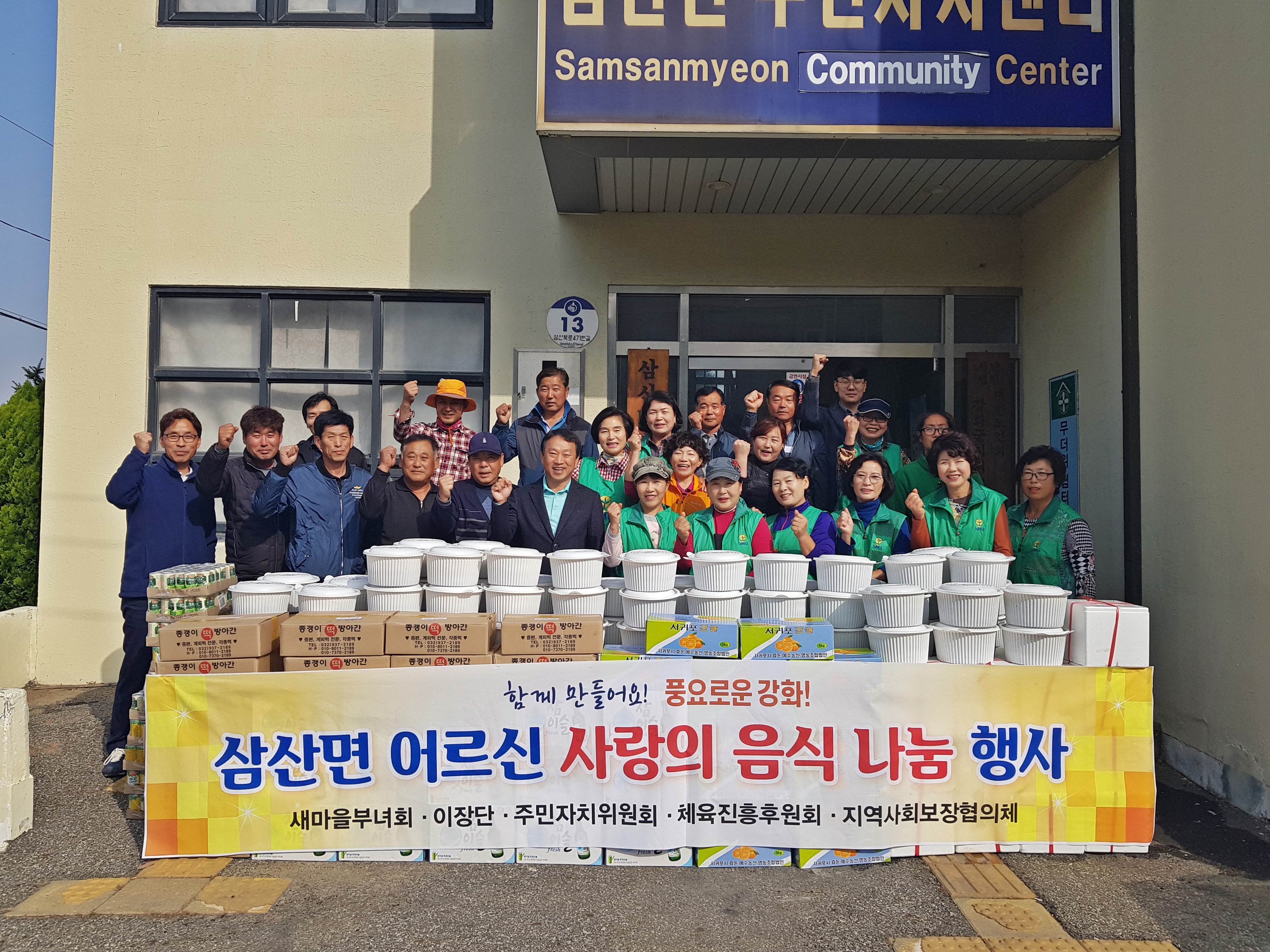 삼산면 부녀회 등 5개 단체는 지난 10월 31일, 관내 각 경로당에서 어르신들께 음식을 대접했다. 이번 행사는 지역 어르신에게 이웃사랑 및 나눔을 실천코자 마련되었다.