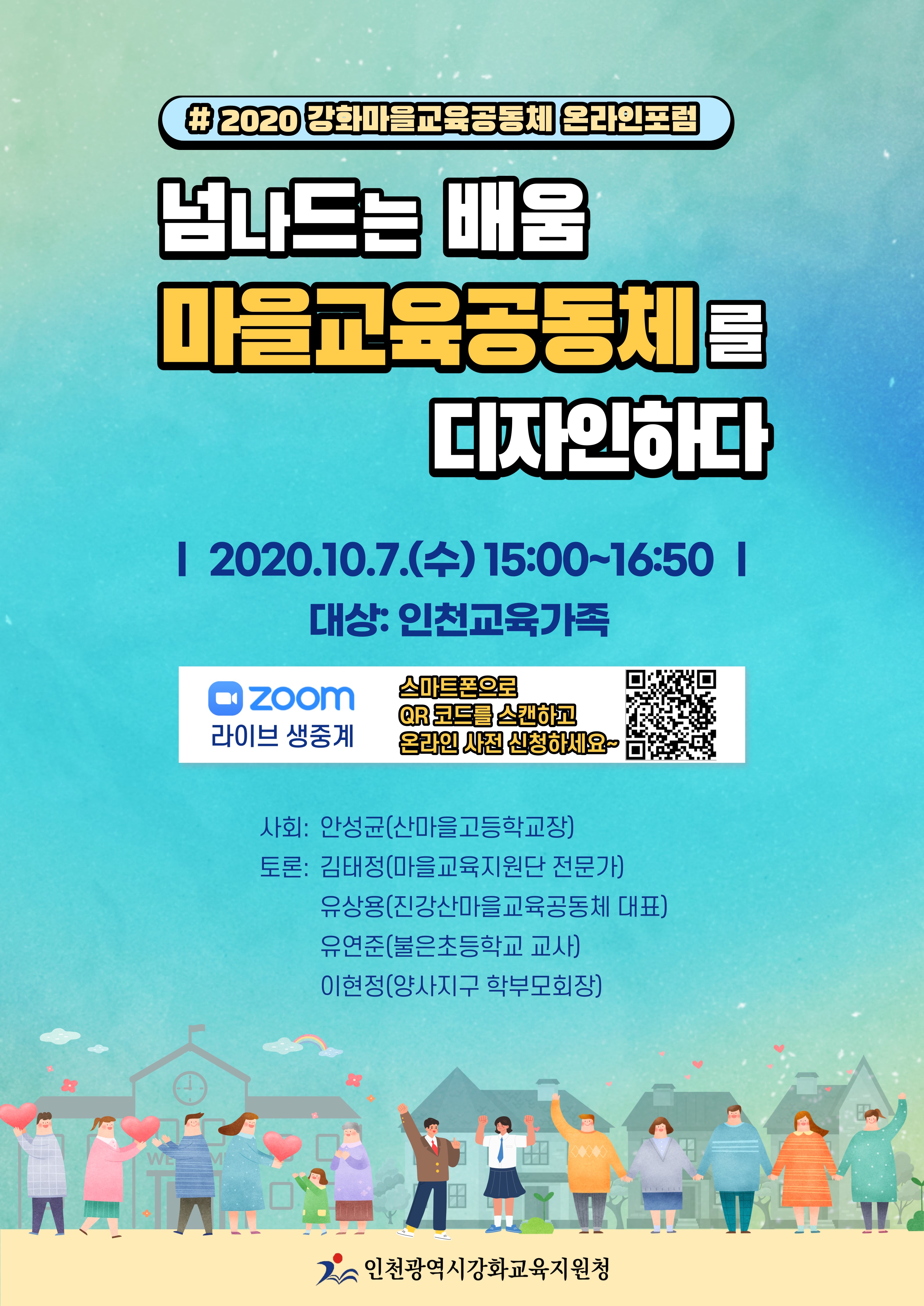 강화교육지원청에서 주관하는 함께 만들고 실천하는 교육공동체 운영을 위한 2020 강화마을교육공동체 온라인 포럼 『넘나드는 배움, 마을교육공동체를 디자인하다』에 많은 참여 바랍니다.