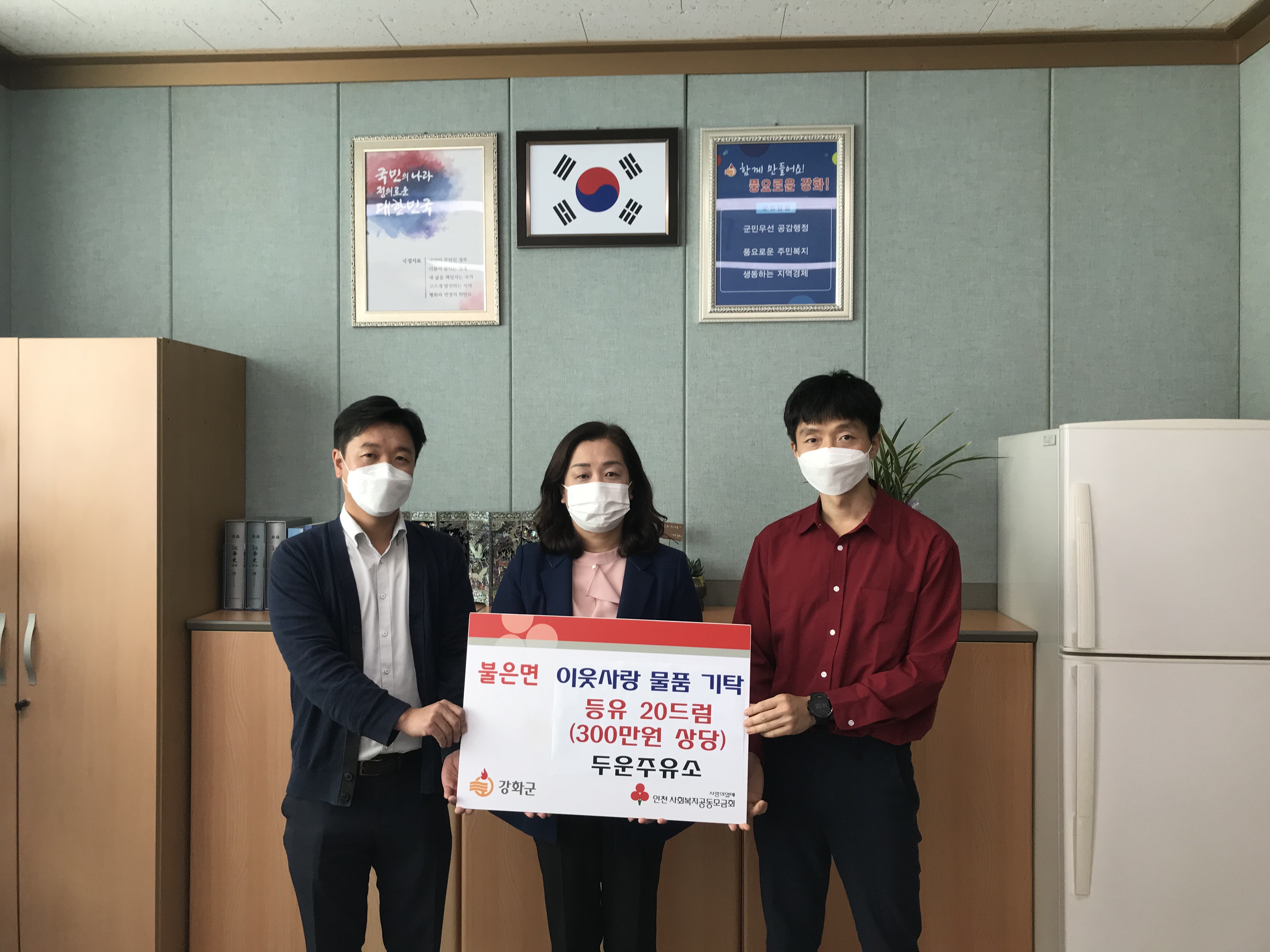 강화군 불은면 소재 두운주유소(대표: 전성수)에서 지난 22일 불은면사무소를 방문해 코로나19로 어려움을 겪고 있는 취약계층을 위해 사용해 달라며 300만원 상당의 등유 20드럼을 기탁했다.