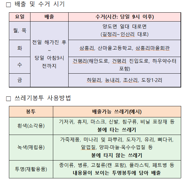 쓰레기 배출 일시와 올바른 종량제 봉투 사용법을 안내드리니,