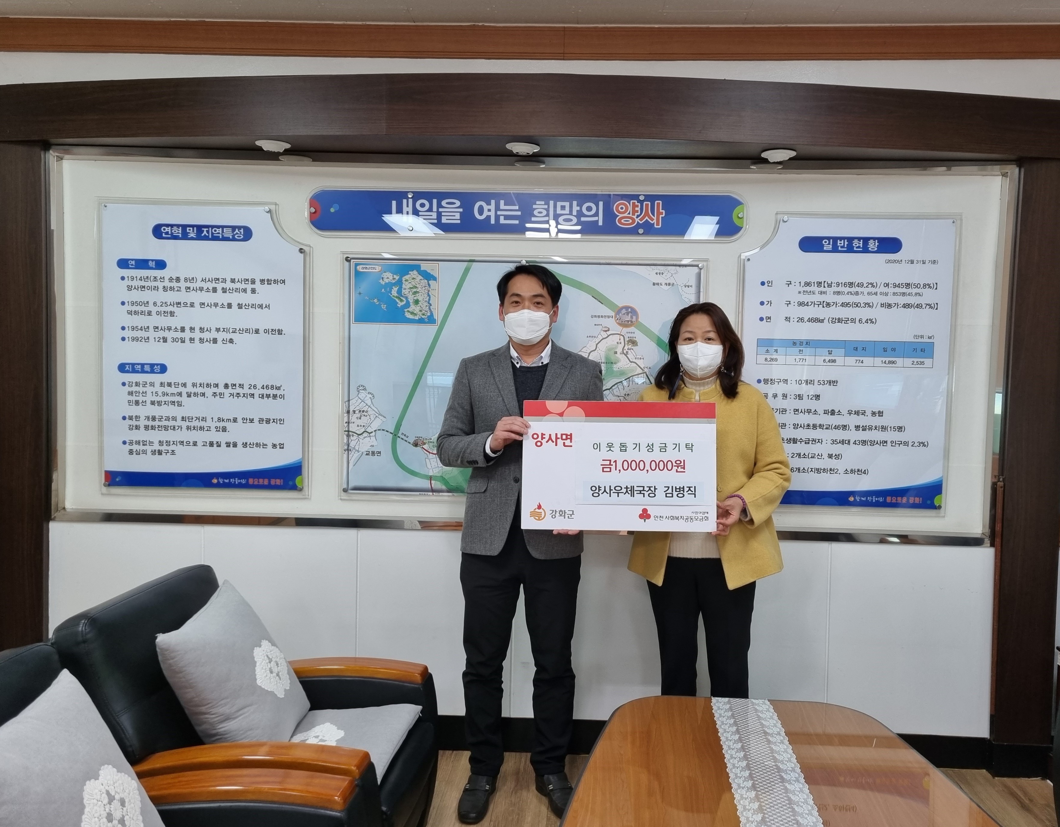강화군 양사우체국장(김병직)은 지난 3일 양사면을 찾아 어려움을 겪고 있는 저소득층을 위해 써달라며 성금 100만원을 기탁했다