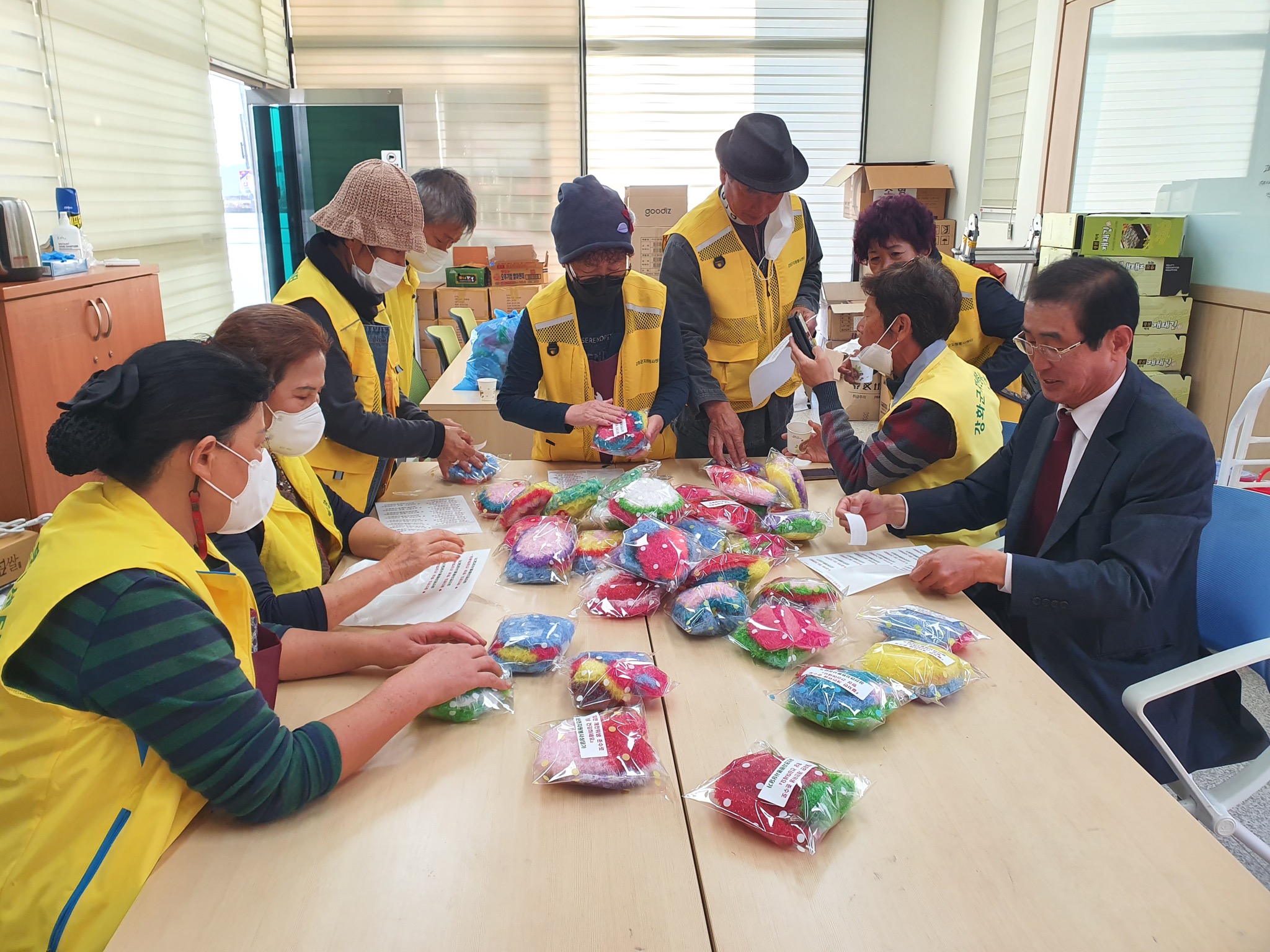 이날 삼산면 자원봉사상담가 15여명은 아침 일찍부터 찐빵과 손두부, 식혜 그리고 예쁜 수세미를 손수 만들어 꾸러미로 준비하여 결식우려 홀몸어르신 및 취약계층 60가구를 직접 가정방문하고 전달하며 안부를 확인했다.