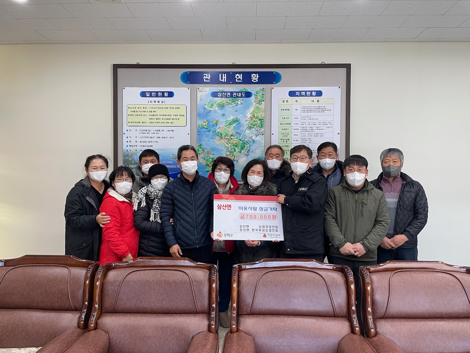 매서운 추위로 얼어붙은 지역 사회에 따뜻한 손길이 펼쳐지고 있다. 지난 16일, 삼산면 농업경영인회(회장 황효상) 및 삼산면 한국여성농업인회(회장 엄순자)는 삼산면사무소를 방문하여 코로나-19와 한파로 힘든 취약계층을 위해 사용해 달라며 성금 70만원을 전달했다.