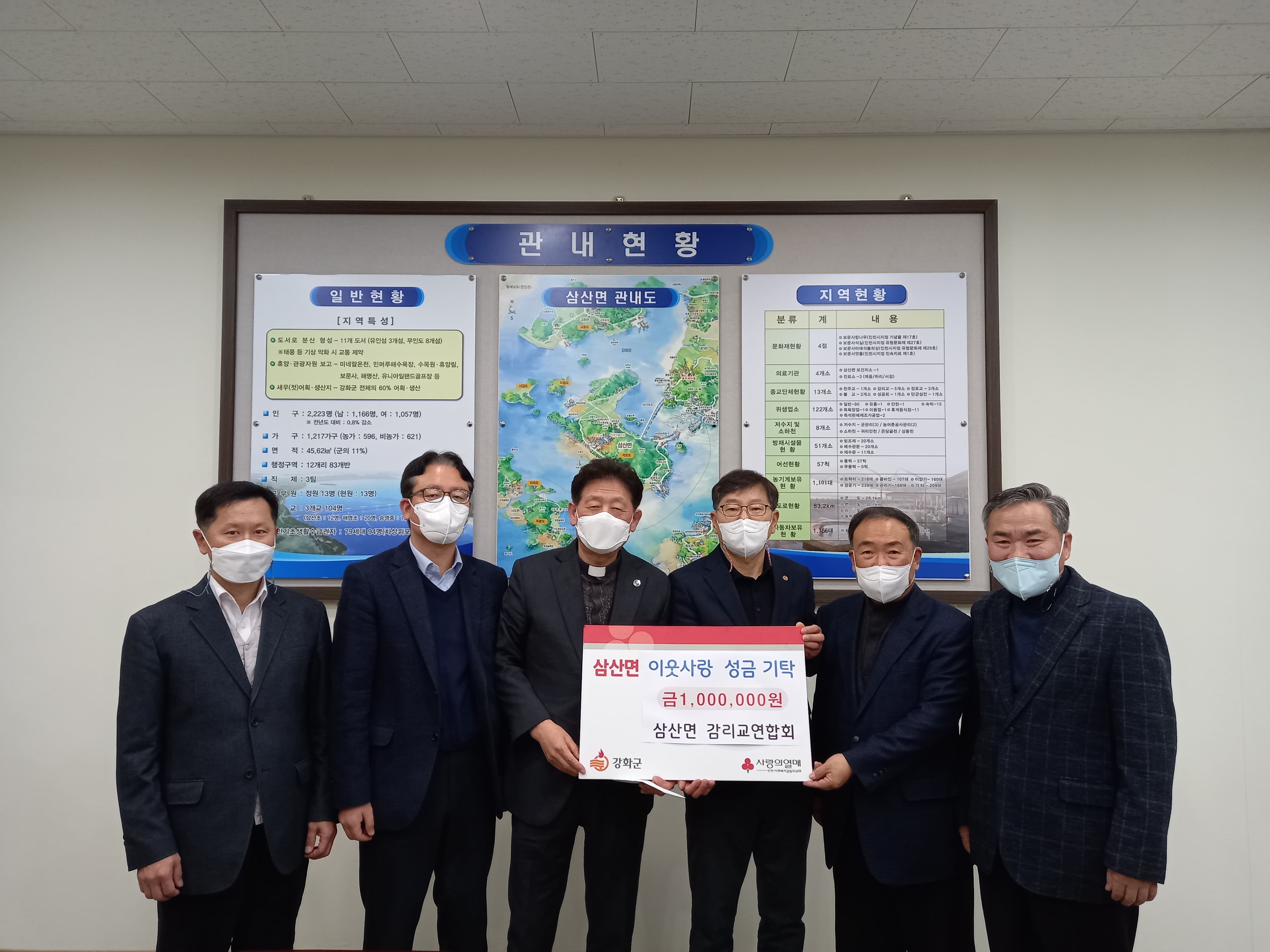 이번 성금 기탁은 삼산면 감리교연합회(회장 황효성)에서 삼산면사무소를 방문하여 어려운 이웃을 위해 써달라며 성금 100만원을 기탁했다.