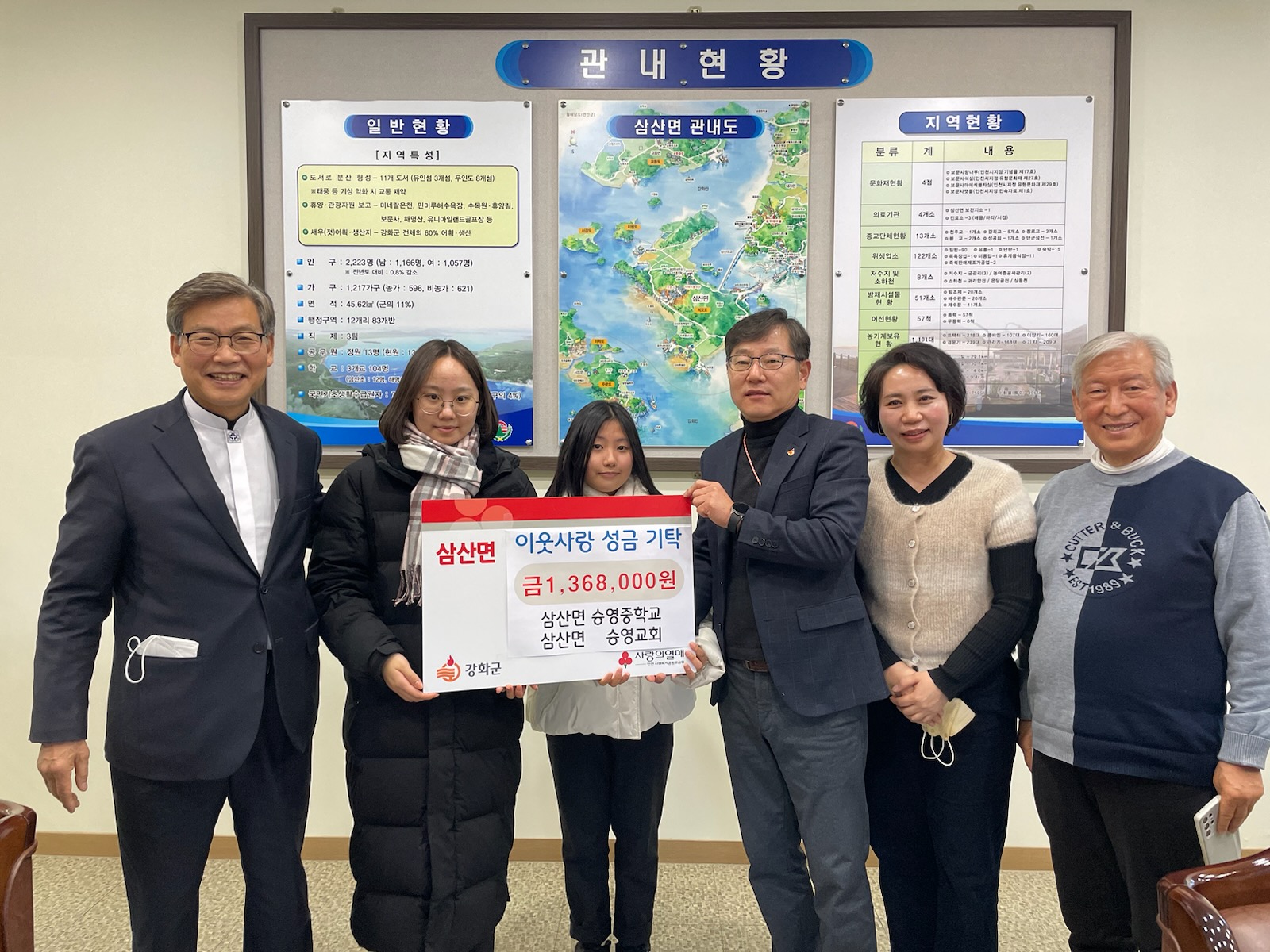 지난 3일, 삼산면 삼산승영중학교·승영교회(이사장 노재환) 일동은 삼산면사무소를 방문하여 새해를 맞아 관내 어려운 이웃들을 위해 성금 136만 8천원을 전달했다.