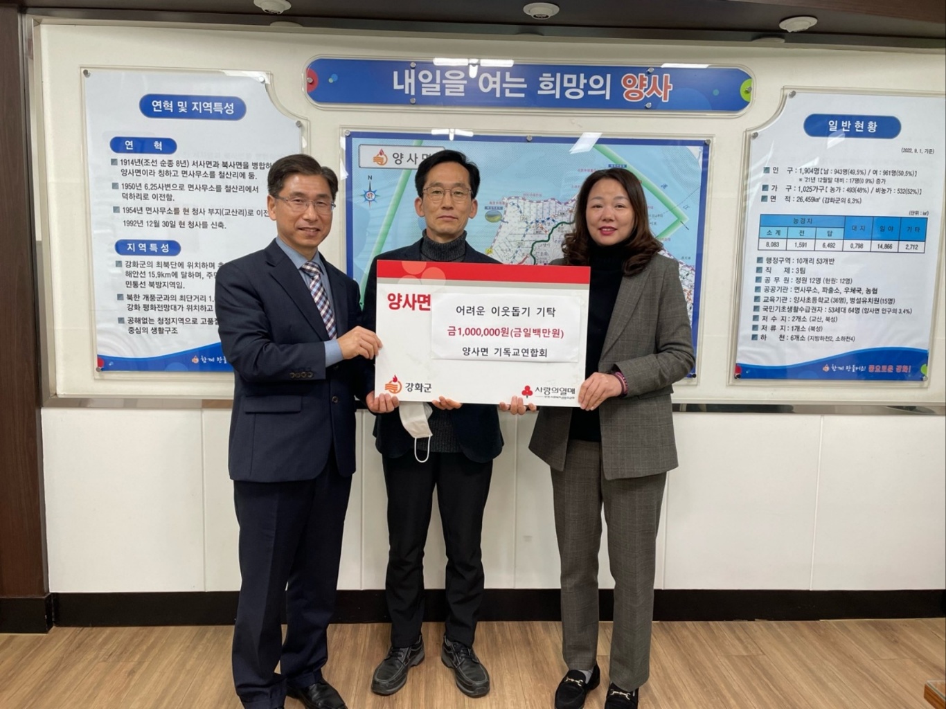 2023년 1월 6일 강화군 양사면 기독교연합회(원충연 목사)에서는 주민 복지 향상을 위하여 인천 사회복지공동모금회에 이웃돕기 성금(1백만원)을 기탁했다.