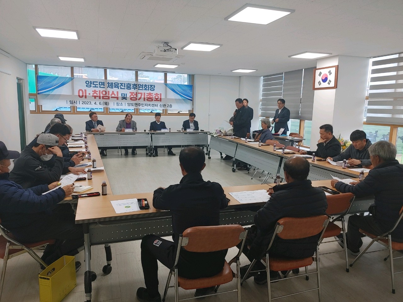 양도면은 지난 6일 양도면 체육진흥후원 회원 및 관내 단체장 30여명이 참석한 가운데 양도면 체육진흥후원회장 이·취임식 및 정기총회를 가졌다.