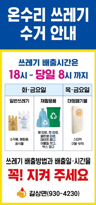길상면은 배출일시와 방법, 그리고 감량을 위한 “3따 3고”캠페인이 적힌 홍보 현수막을 전신주 곳곳에 게시하여 누구나 볼 수 있도록 하였다.