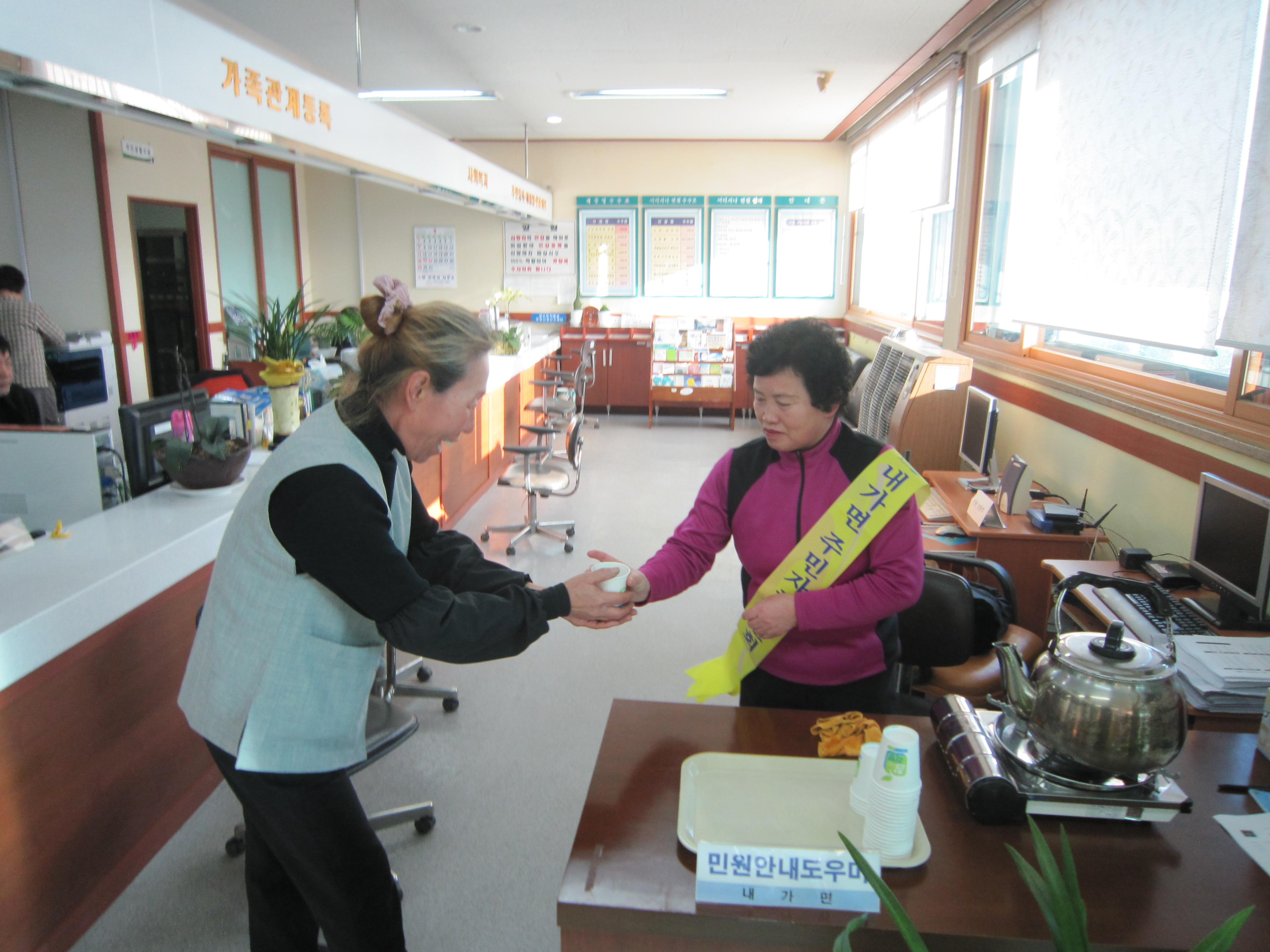면사무소를 찾는 방문객들에게 차제공과 함께 민원 안내를 해 드리는 봉사 행정이다.