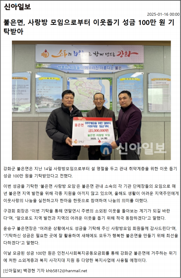 불은면 사랑방 모임 이웃 돕기 성금 100만원 기탁