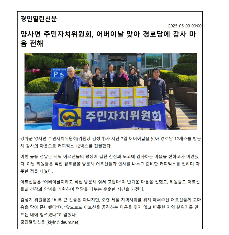 양사면 주민자치위원회, 어버이날 맞아 경로당에 감사 마음 전달