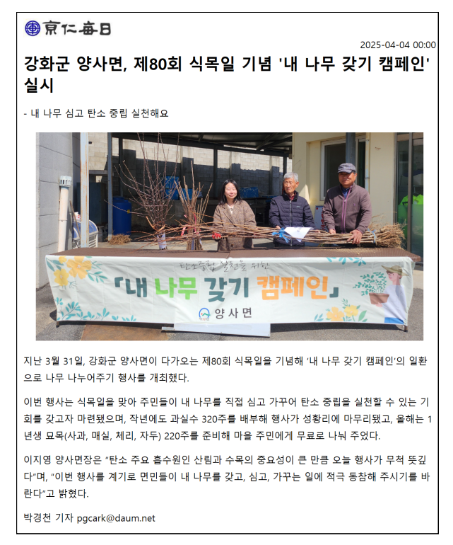 양사면, 제80회 식목일 기념 '내 나무 갖기 캠페인' 실시