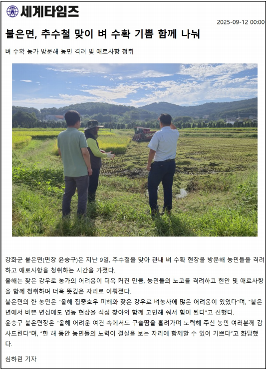 불은면, 추수철 맞이 벼 수확 기쁨 함께 나눠