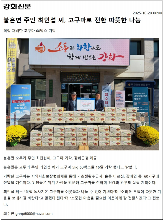 불은면 주민 최인섭씨, 고구마로 전한 따뜻한 나눔