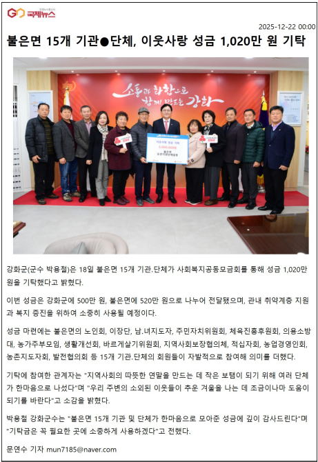 불은면 15개 기관단체, 이웃사랑 성금 1,020만원 기탁