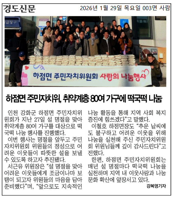 하점면 주민자치위원회, 설 명절 맞아 취약계층 80여가구에 떡국떡 나눔