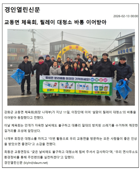 교동면 체육회, 릴레이 대청소 바통 이어받아