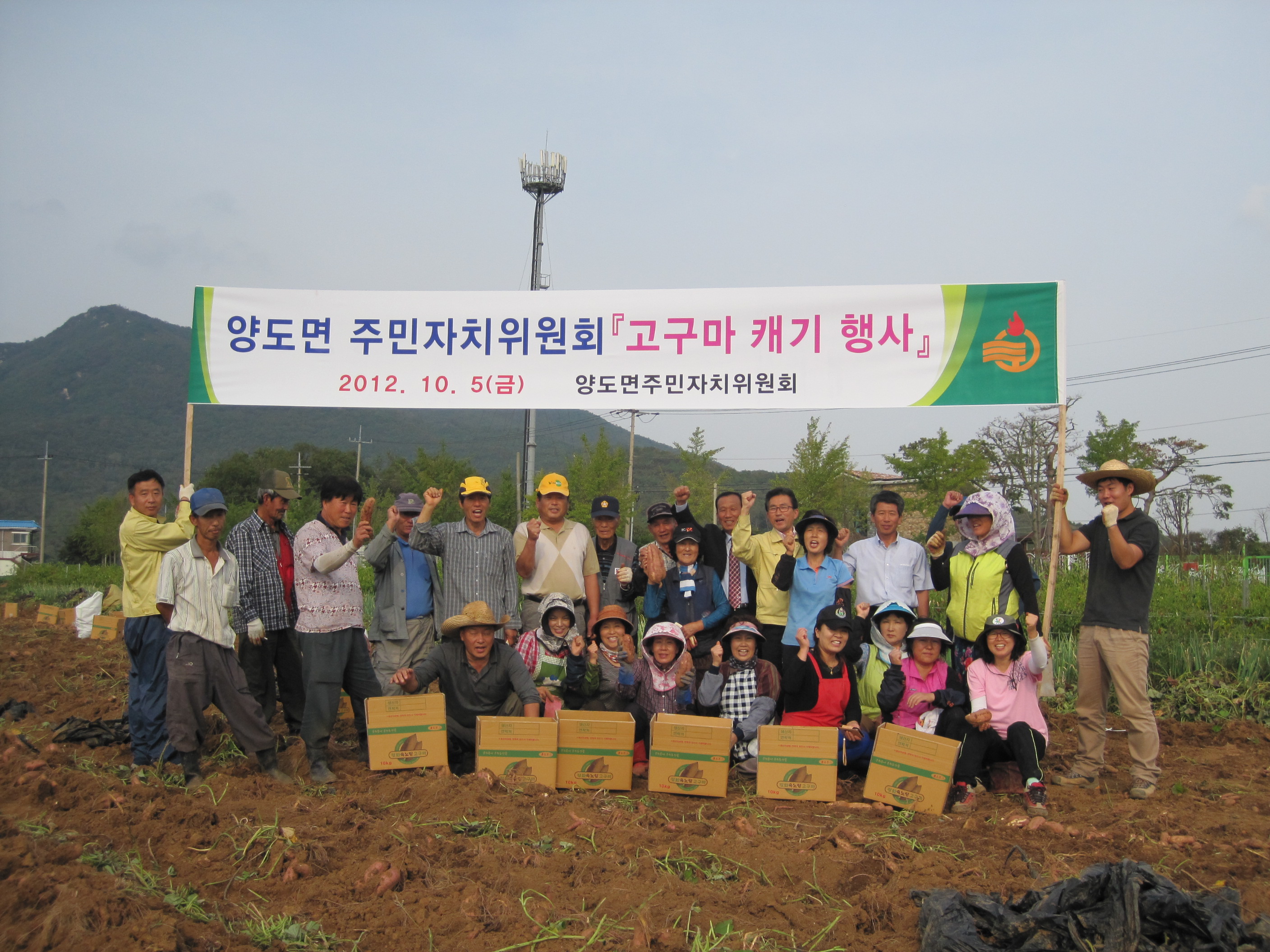 양도면 주민자치위원회(위원장 김옥현)은 10월 5일(금) 20여명이 참석한 가운데 고구마 캐기 행사를 실시했다. 이번 행사는 어려운 이웃을 돕기 위한 뜻깊은 행사로 능내리 일대에서(2,640㎡) 구슬땀을 흘리며 고구마 캐기 행사를 가졌다.