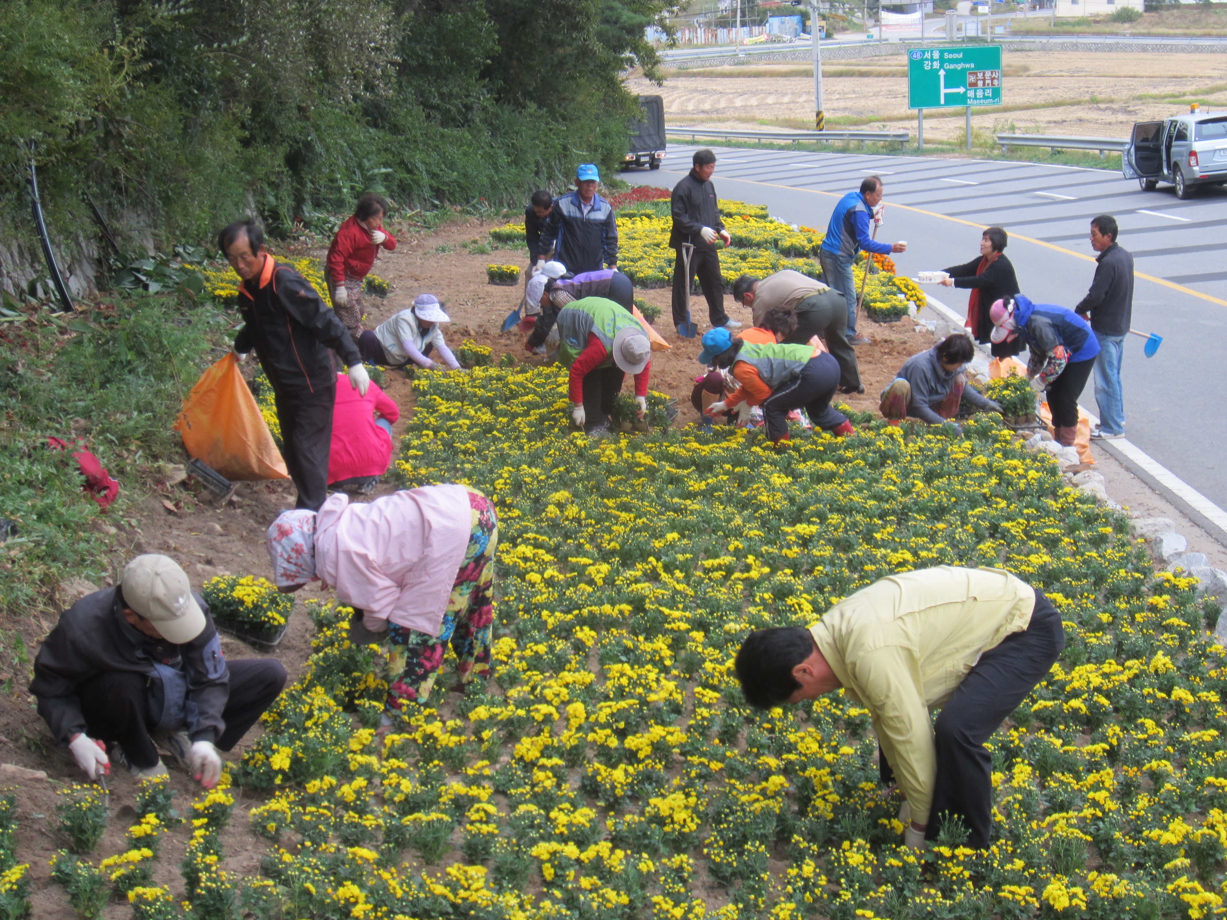 삼산면 주민자치위원회(위원장 한국현)는 지난 10월 15일 석포리 공개화단에서 주민자치위원 및 지역주민 등 30여명이 참여한 가운데 가을 국화 6,500본을 식재하여 화사한 노란국화 꽃밭을 조성했다.
