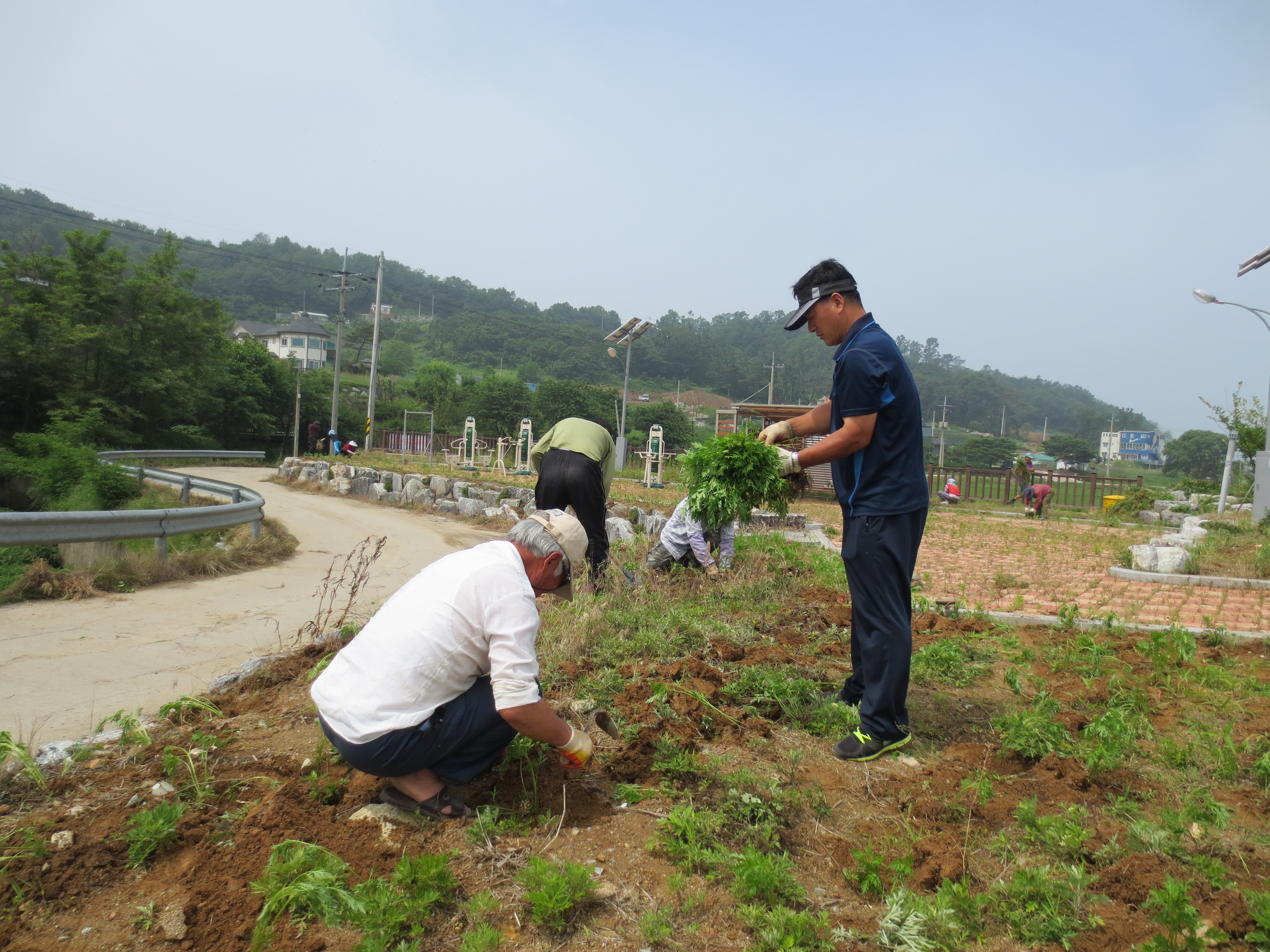 장화1리(이장 조덕환)에서는 6월 13일 마을이장을 비롯한 주민 20여명이 모인 가운데 장화리 테마공원 주차장 및 수변무대 주변 화단을 가꾸며 구슬땀을 흘렸다.