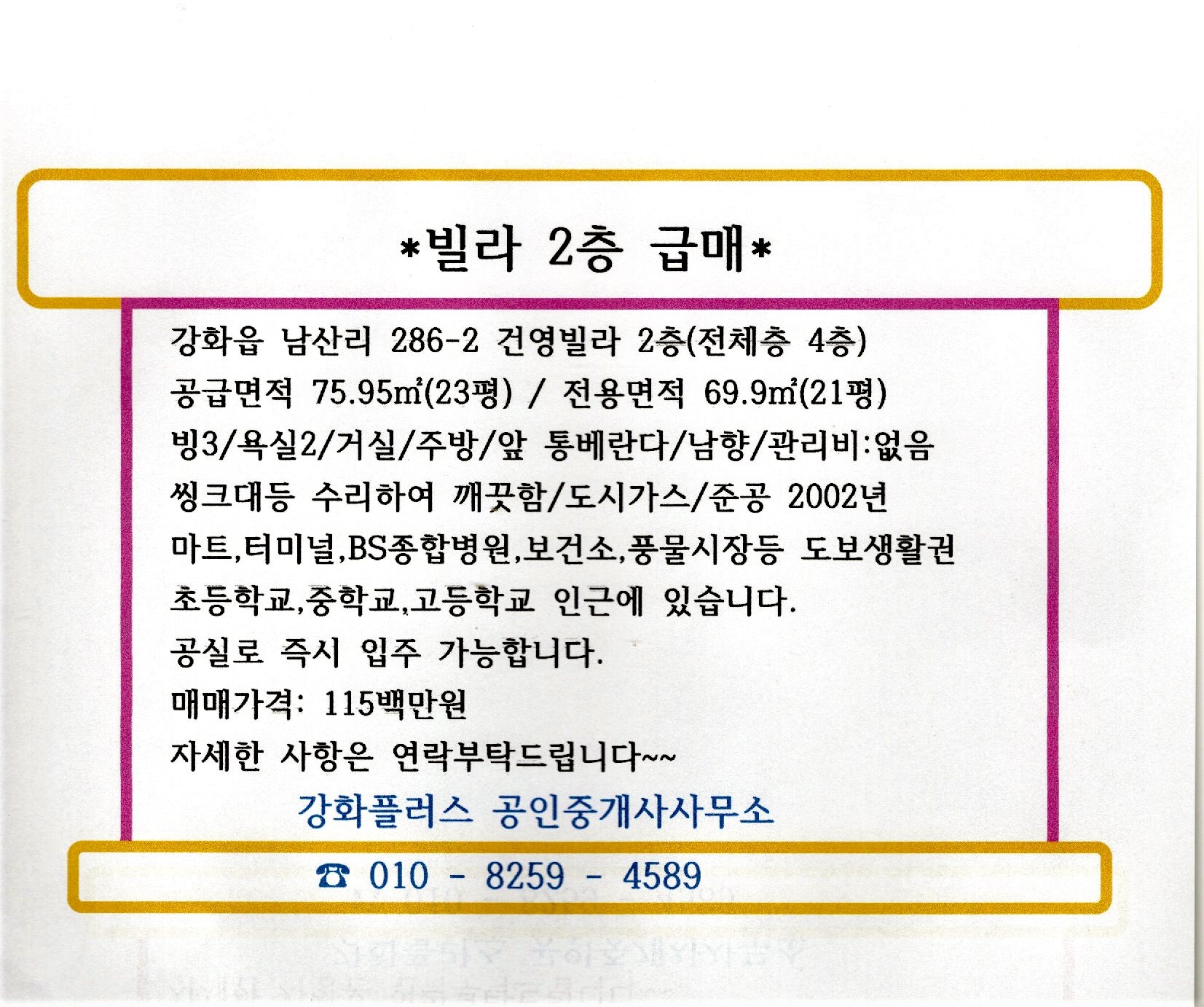 *강화읍 남산리 빌라 2층 급매 115백만원(도보생활권,비에스병원근처/내부 깨끗이 수리됨)*