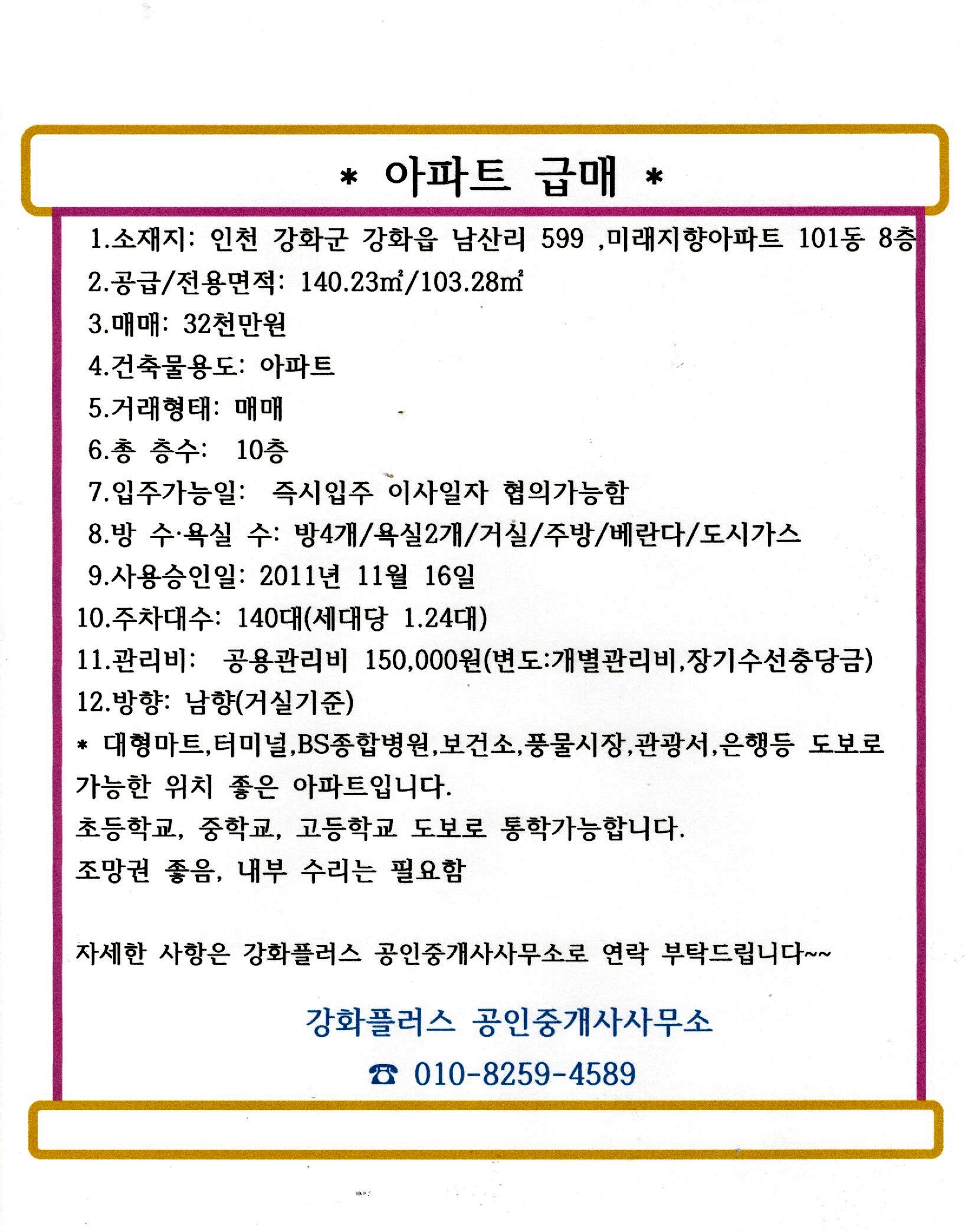 * 미래지향아파트 42평형 급매 32천만원(강화읍 남산리/위치/층수 좋음)*