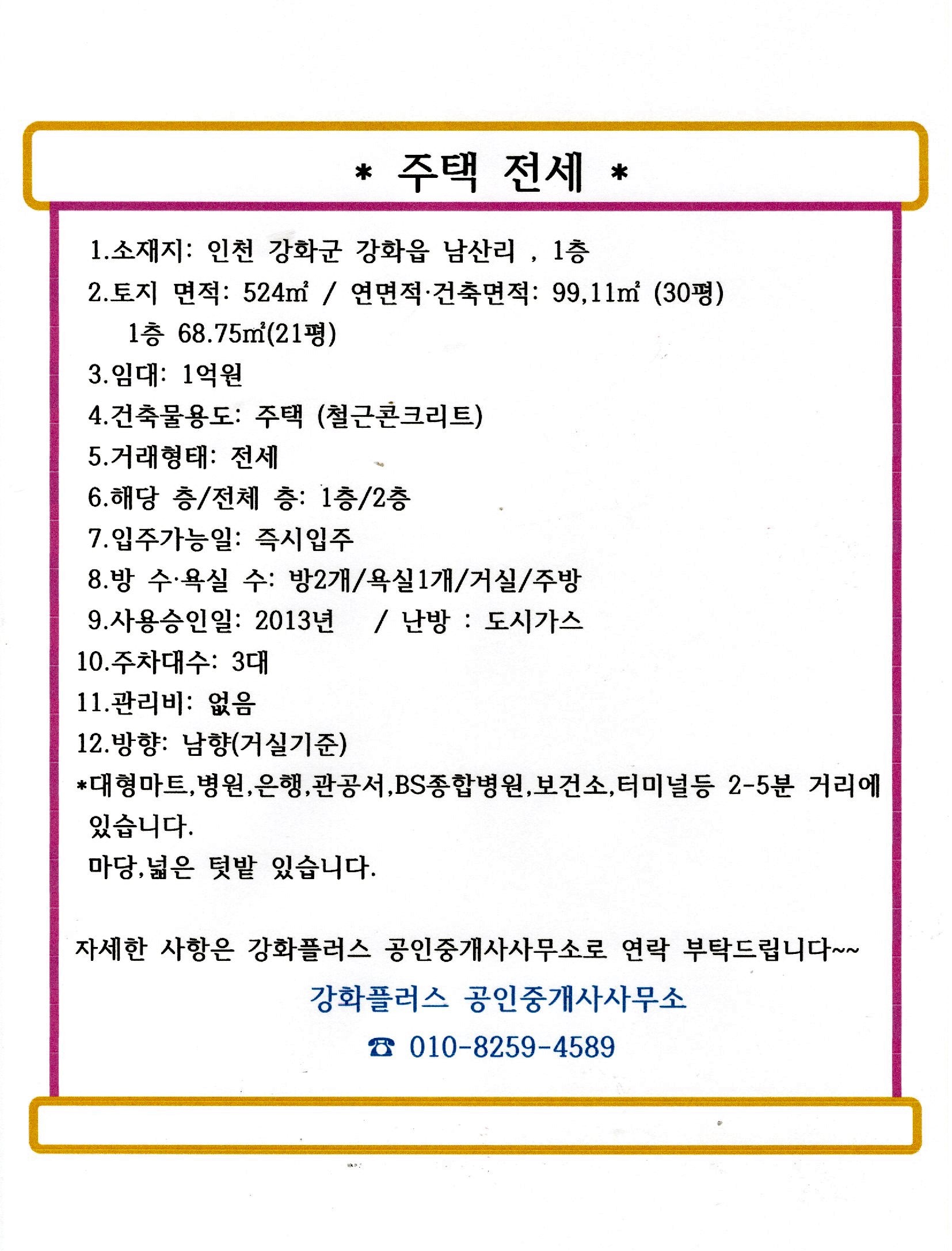 *도시가스,텃밭있는 강화읍 주택전세 1억원(1층/강화읍 남산리/철근콘크리트)*