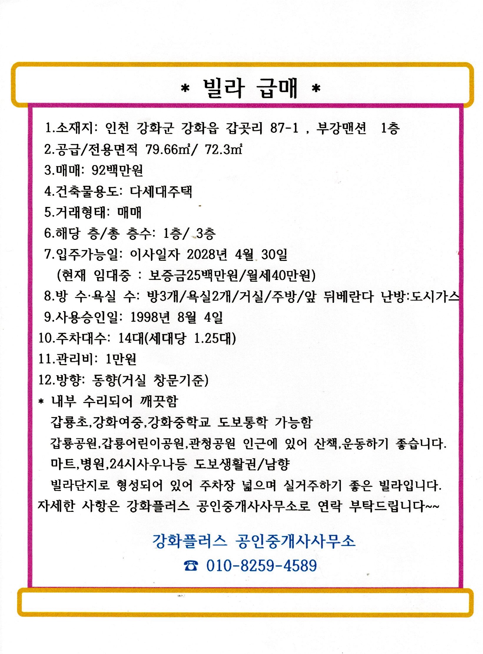 *부강맨션 1층 급매(내부 수리함/강화읍 갑곳리 갑룡초 인근/주차장넓음)*