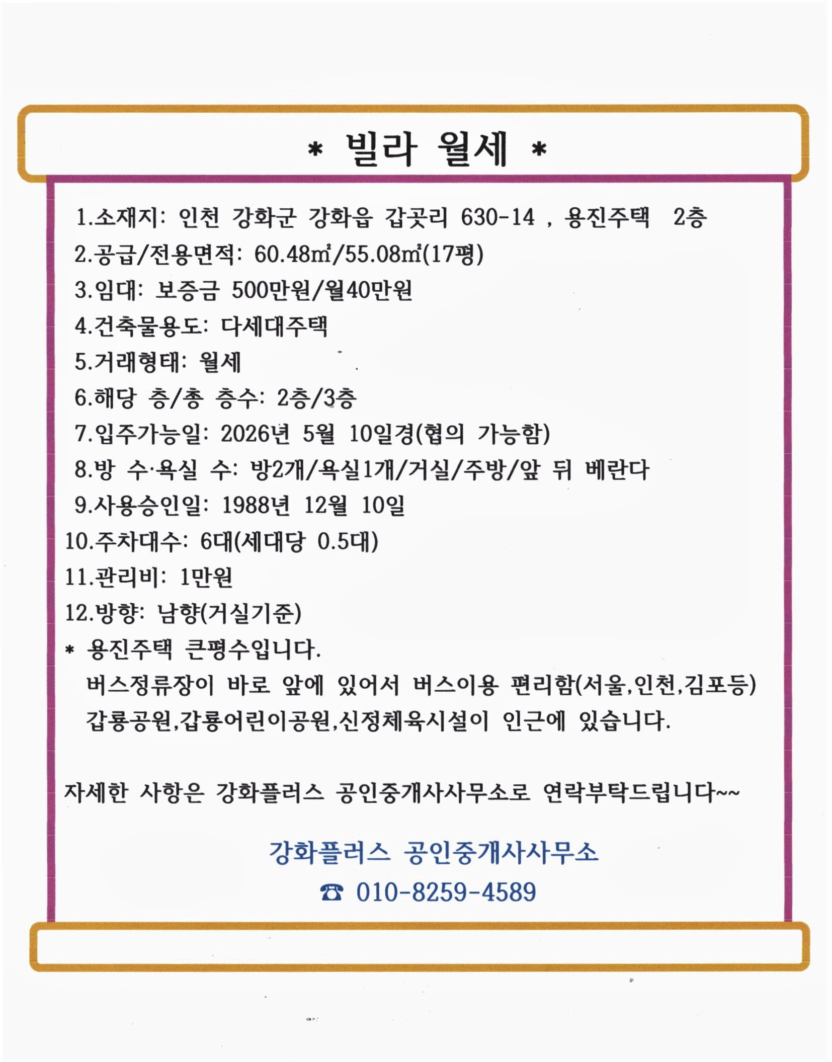 *빌라 2층 월세(보증금500만원 월40만원/강화읍 갑곳리/남향)*