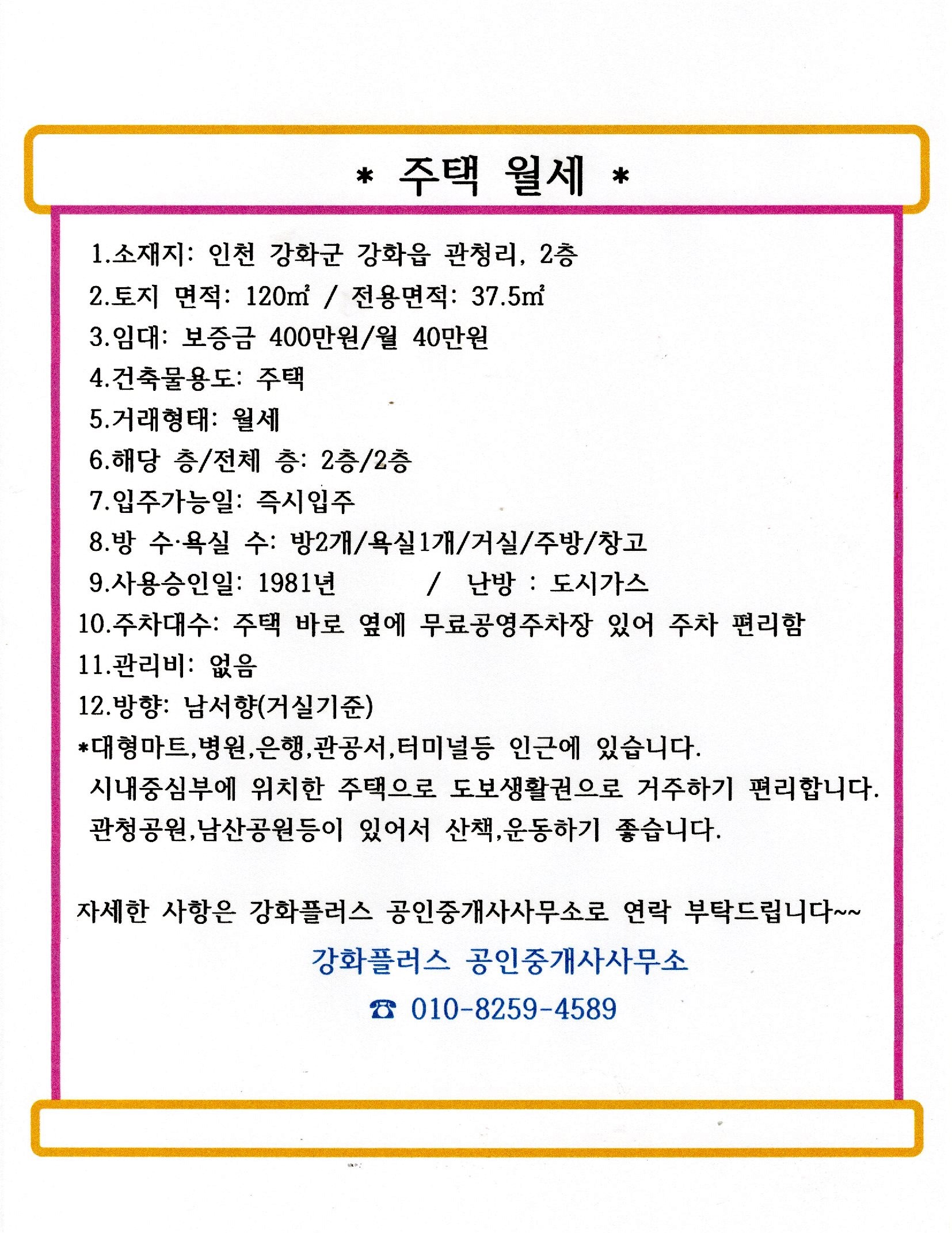 *주택 2층 월세(강화군청인근/강화읍 관청리/도시가스/도보생활권/즉시입주가능함)*