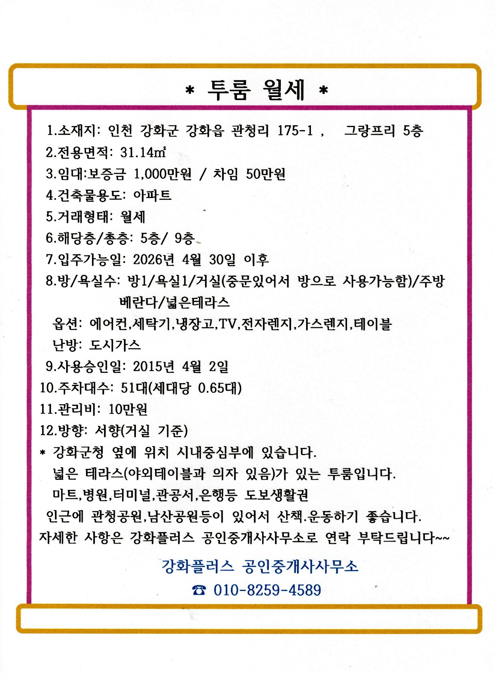 *넓은 테라스 있는 그랑프리 투룸 월세(강화읍 관청리/강화군청옆/엘리베이터)*