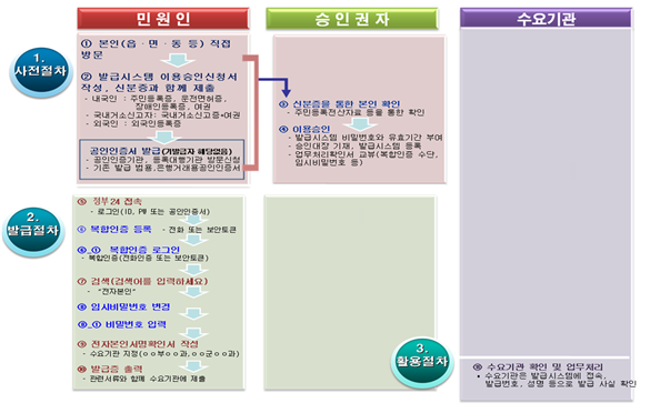 - 전국 시‧군‧구청 및 읍‧면‧동사무소 등에 신분증과 전자본인서명확인서 이용승인 신청서를 제출하고, 온라인상 정부24를 이용하여 전자본인 서명확인서 작성 후 해당기관에 발급증을 제출함.