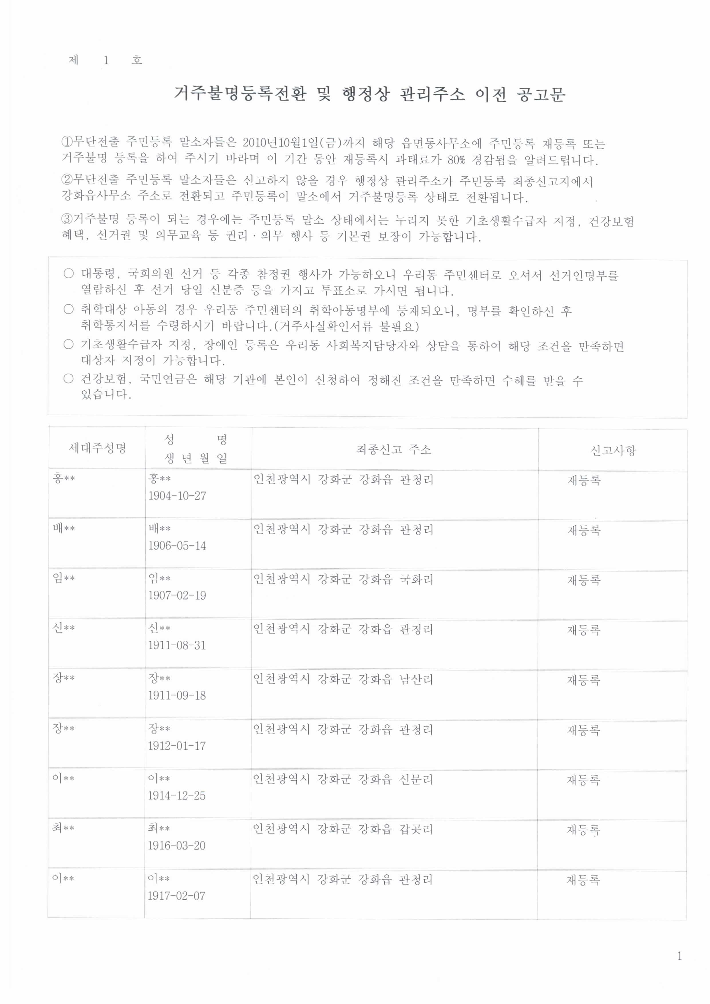 주민등록 말소자의 거주불명등록 전환 공고입니다.